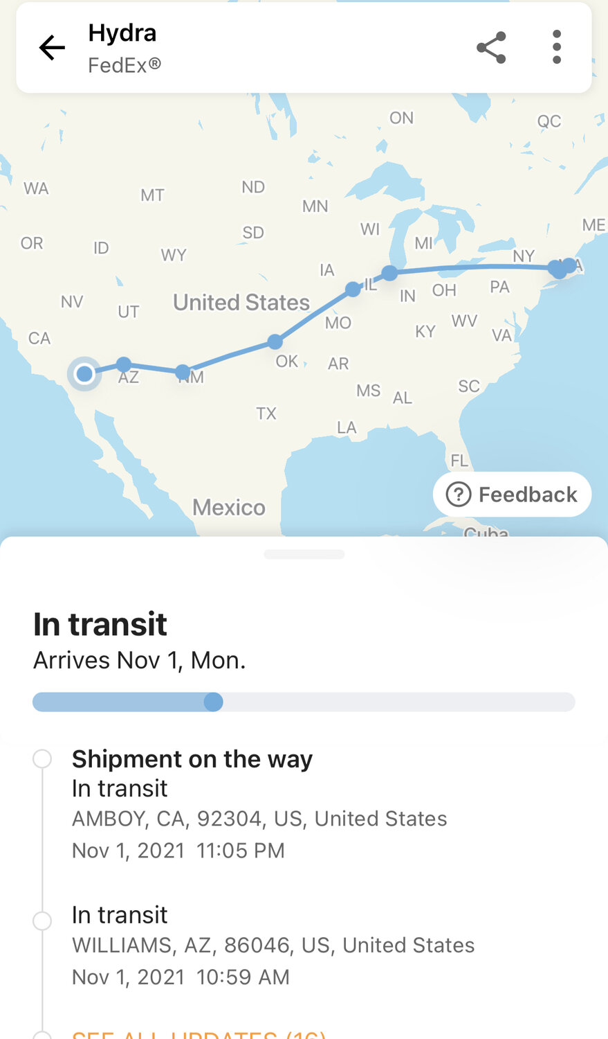 Lol, Fedex is never accurate. My current arrival date says Thursday as it's just passing through Colorado. We'll see.I have to laugh as I got notice last Monday that my Hydra was due to arrive October 29…then October 30 and quickly October 31 (still says that on FedEx page). So I called FedEx and they told me it is due to arrive to my house today. About 15 minutes later I got the update below….