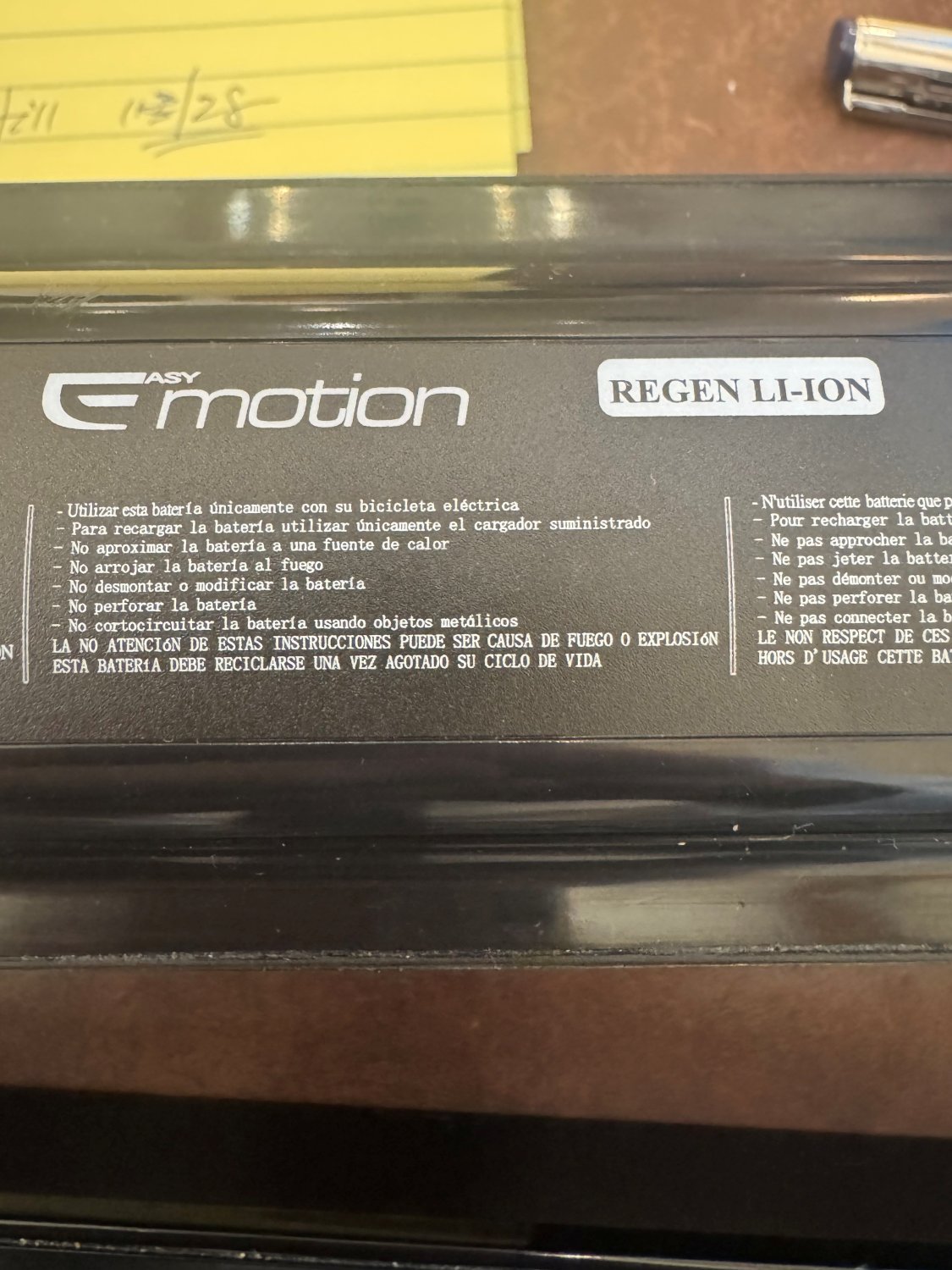 Hi everyone! I have an Easy Motion electric bike that is about 10 years old. The battery charger was lost, and I am told the battery, after sitting uncharged for so long, is likely in need of replacement. So, I am looking for a battery and a charger. I have attached some pictures of the battery for reference; it's about 18-19 inches long and about 2" x 2.5" in circumference." If anyone has information on these items, I would appreciate hearing from you. Thank you! If you are inclined to email, my address is [email protected] - Marshall