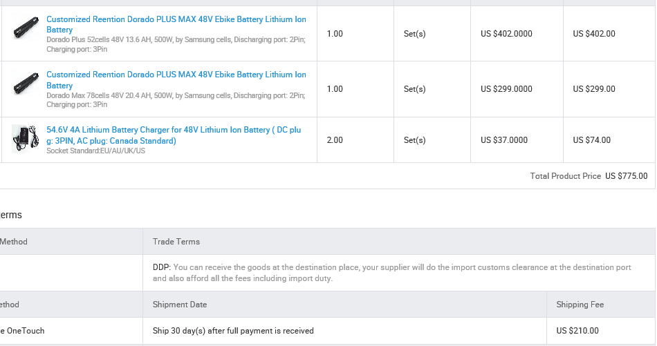 Note: I ordered there upgraded fan cooled battery chargers which have double the output and a different electrical end. If your going to use the stock plastic battery charger you will need to specify that in your order for that end, just send Susie the picture. Some of the questions on my order was what wall electrical end did I want, I sent the picture which is the same in North America...this company builds battery’s for all country’s and that’s important that you get that 115/120 3 prong. Susie and I through many e-mails got this down. Regards Robert ??