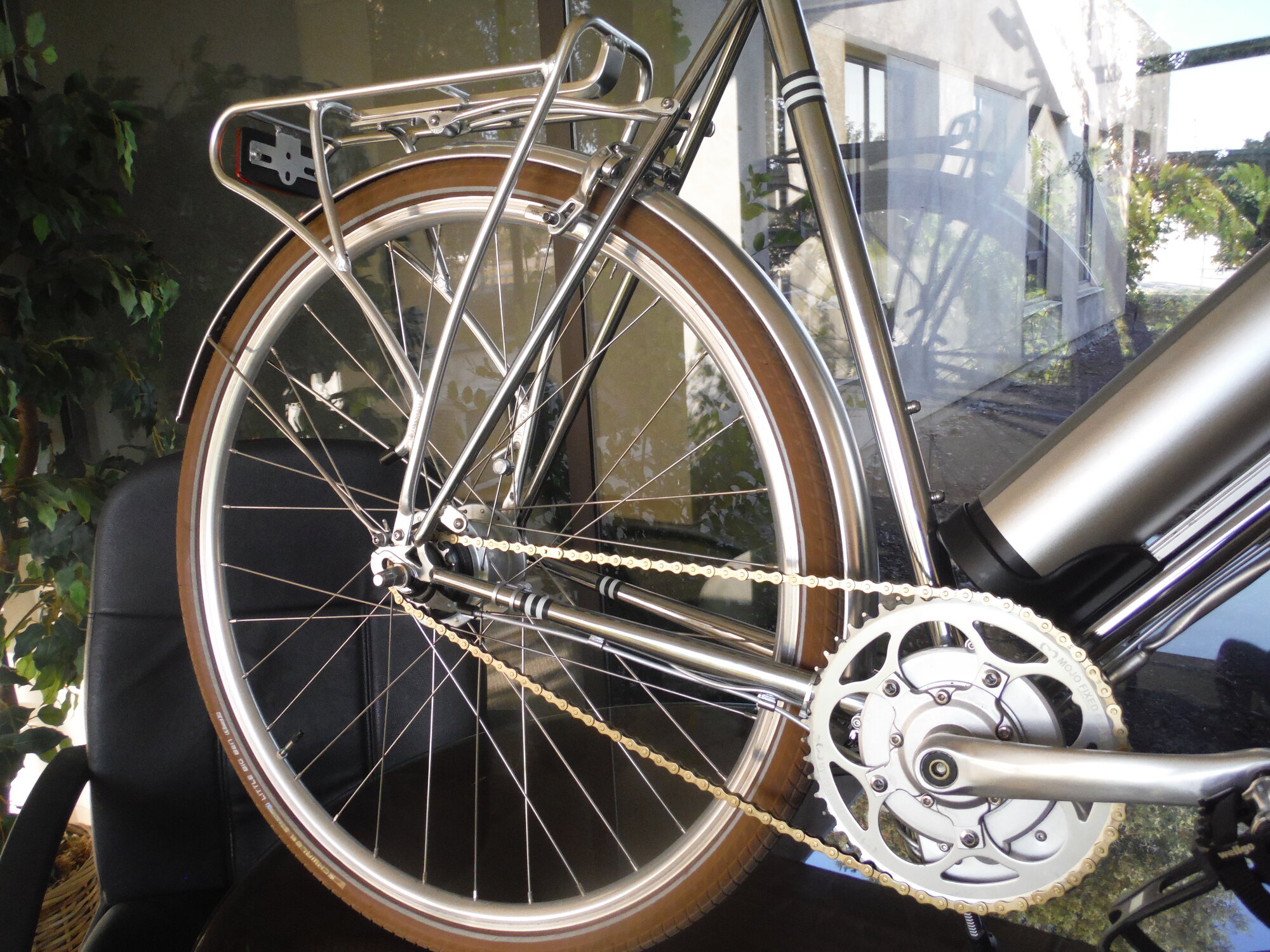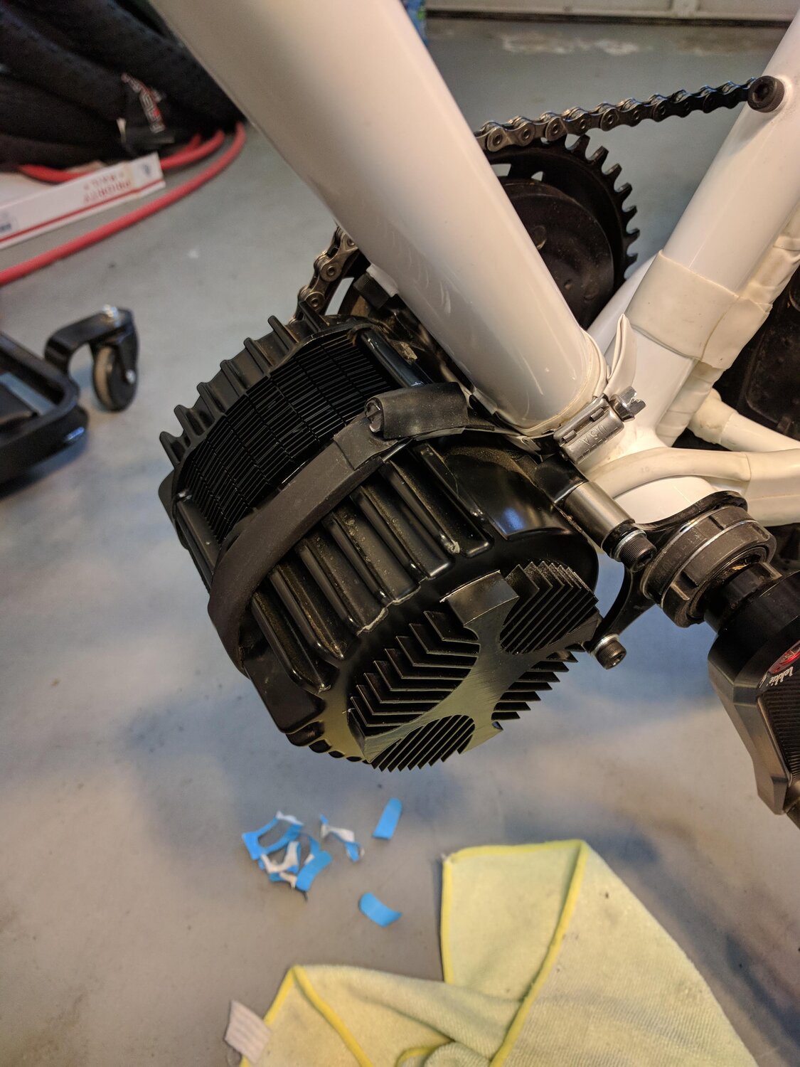 The first of the two is to use a pair of interlocking hose clamps. One really big one goes around the body of the BBSHD, front to back. Interlocking with this 'ring' is another that wraps the down tube of the bike. You use black heatshrink to line the one wrapping the black BBSHD (no need to heat it up) and some silicone tape or color-coordinated heatshrink (or both) around the frame tube to prevent any scraping and also to render the clamp well nigh invisible. This makes a physical, unbreakably stable connection to the frame using $5 worth of materials. Done right, it is invisible. I have BBSHDs I installed in 2017 still locked up tight with this method.