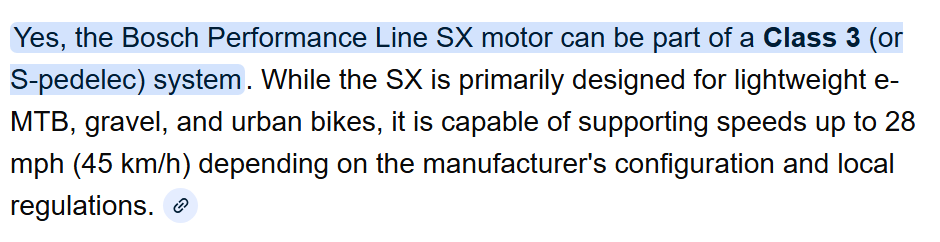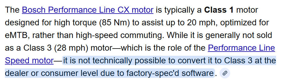 Yes, but beyond that, I'm surprised the Bosch SX motor is not mentioned in this thread. By changing power characteristics in the Flow app, you actually might be able to limit speed, though you can't tell it: "Hey, limit me to 20 MPH." You can adjust the max power for four modes and probably have the same result, but that's not going to help you if you get stopped for riding on a mixed use trail.