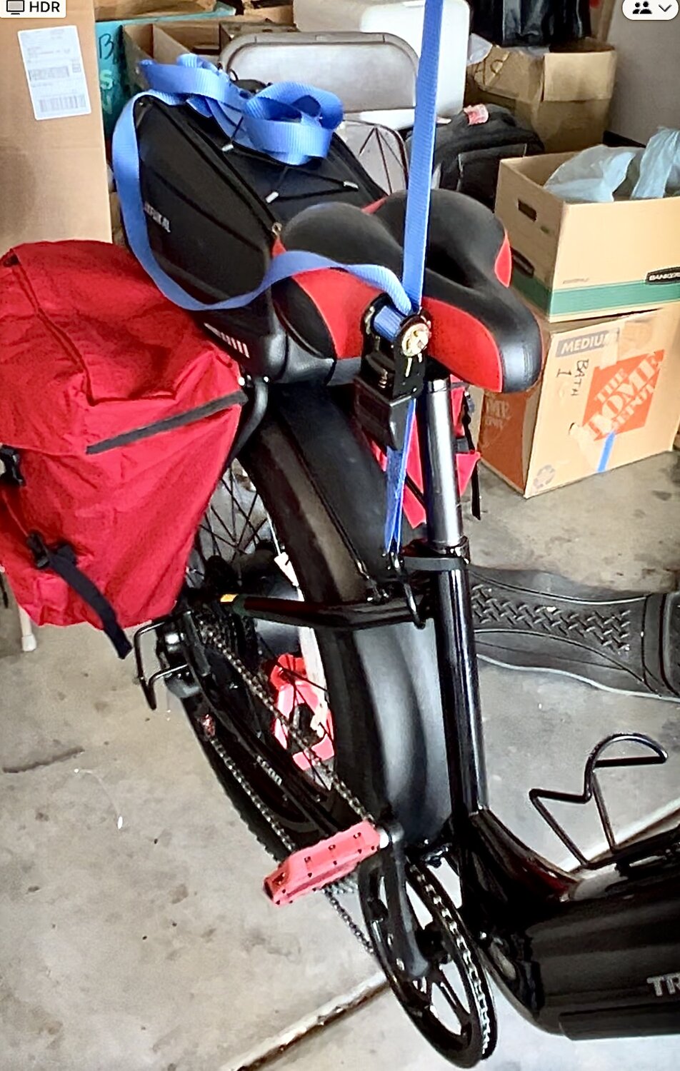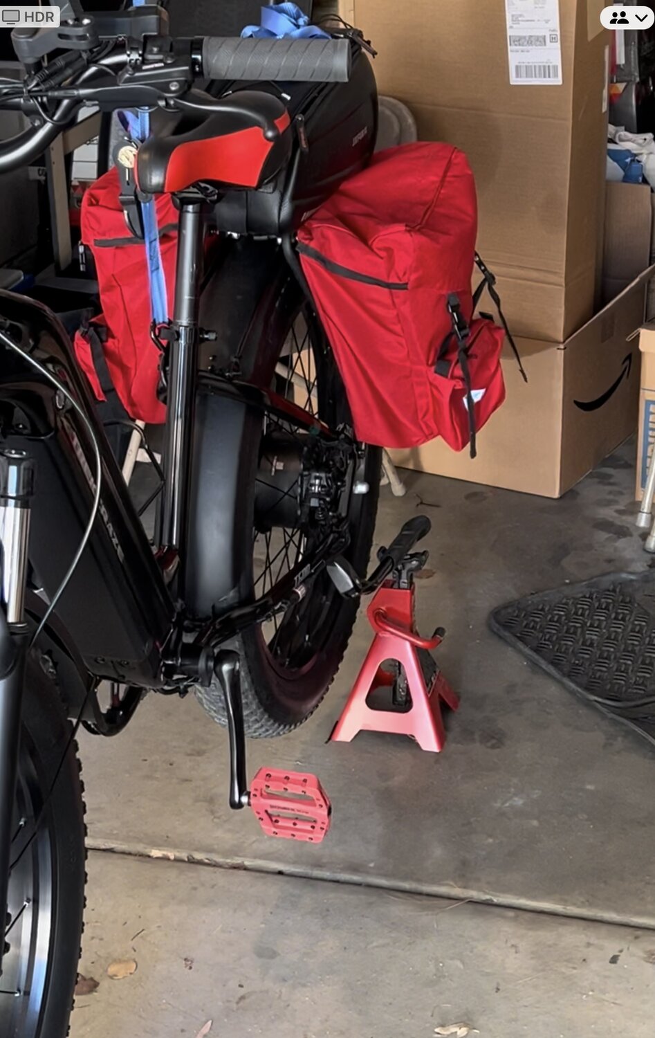 I have been contemplating getting a bike maintenance stand for my ebike , besides the cost how do you actually raise up an 85 pound bike so you can do maintenance? Well I went to Harbor freight tools and bought me a ratcheting tiedown 500 pound weight limit, then I got out some jackstands that I already had and fashioned a lift of my own. It works perfectly. I use a jack stand on the folded up kickstand so it sits far enough away from the wheel and I use the tiedown hooked onto the frame underneath my seat And lifted up high enough and it is very sturdy so I can work on my gear and derailer adjustments. I also taken an old Vespa scooter tire and place it flat underneath the front wheel to help it remain steady. Interestingly I used to fix Vespa scooters that tire belonged to Owen Wilson's scooter ,I used to work on in Malibu. Now that I'm disabled I need all the help I can get and I just don't think a maintenance stand will allow me to lift the bike up.