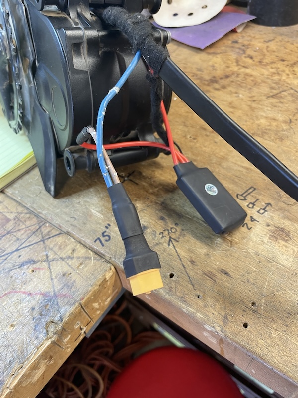 The "new" modified harness that came with the battery had a longer pigtail so I had to shorten this of course as it wasn't exiting the motor case as originally designed. So I cut and reinstalled a new xt60 plug on the now shortened cable.