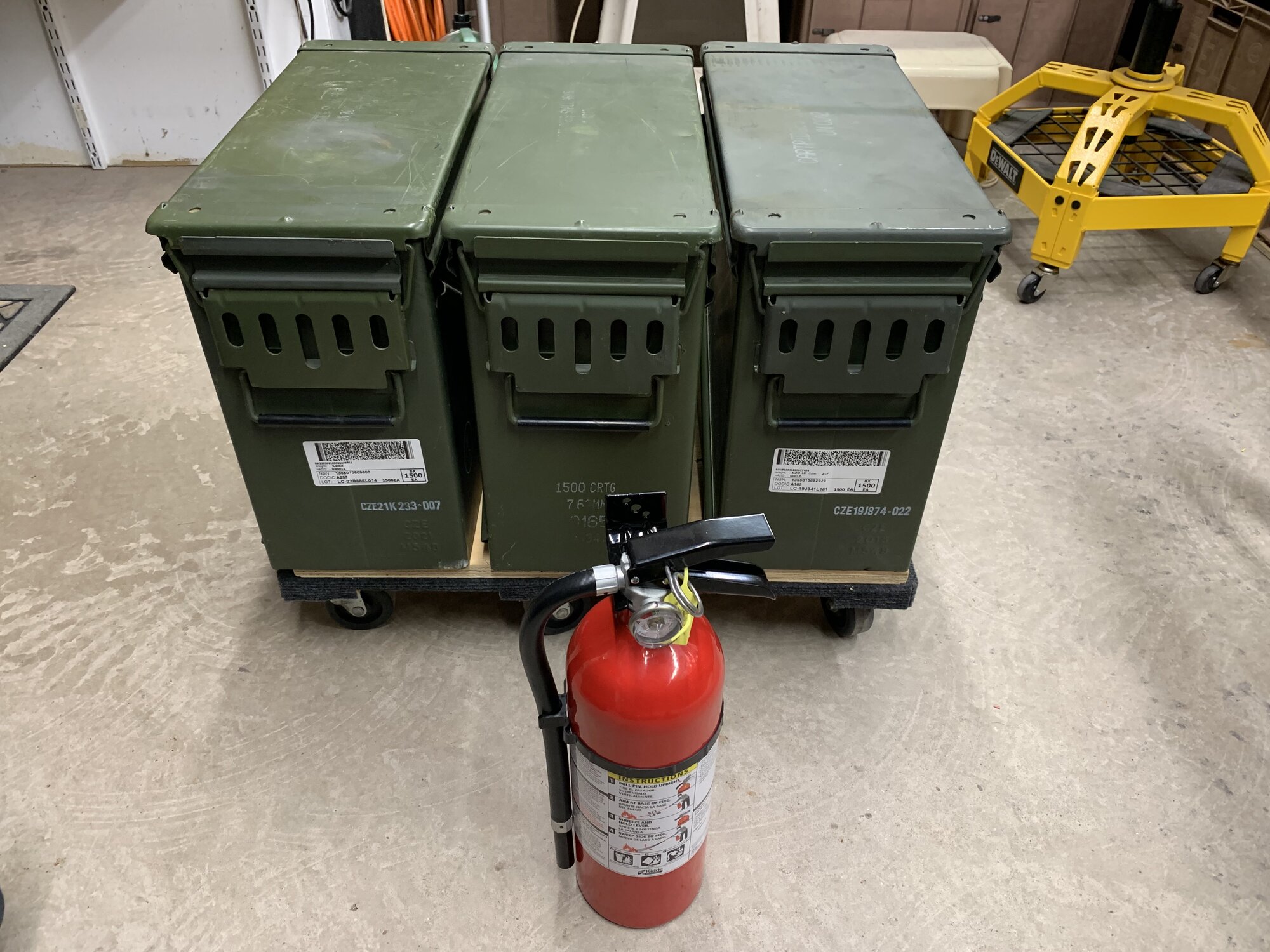 I realize the ammo cans are not sufficient to fully contain a battery fire, I use them more as a delaying tactic. I never charge unattended and always under a smoke alarm. If the alarm is triggered, hopefully, it will give me time to roll the dolly mounted cans out of the garage before the fire becomes too intense. I'm also looking at adding a fire resistant liner to the charging can. Perhaps something as simple as cement board would be an improvement.