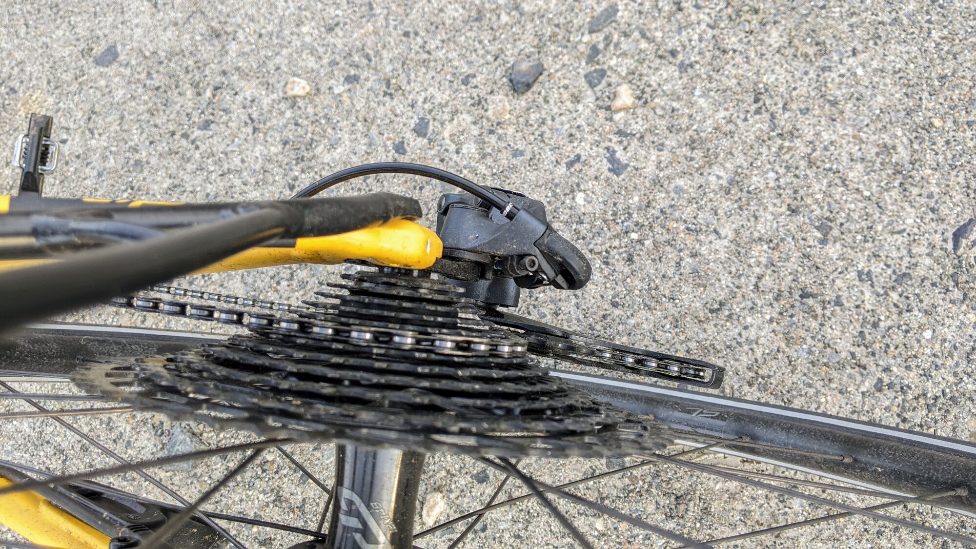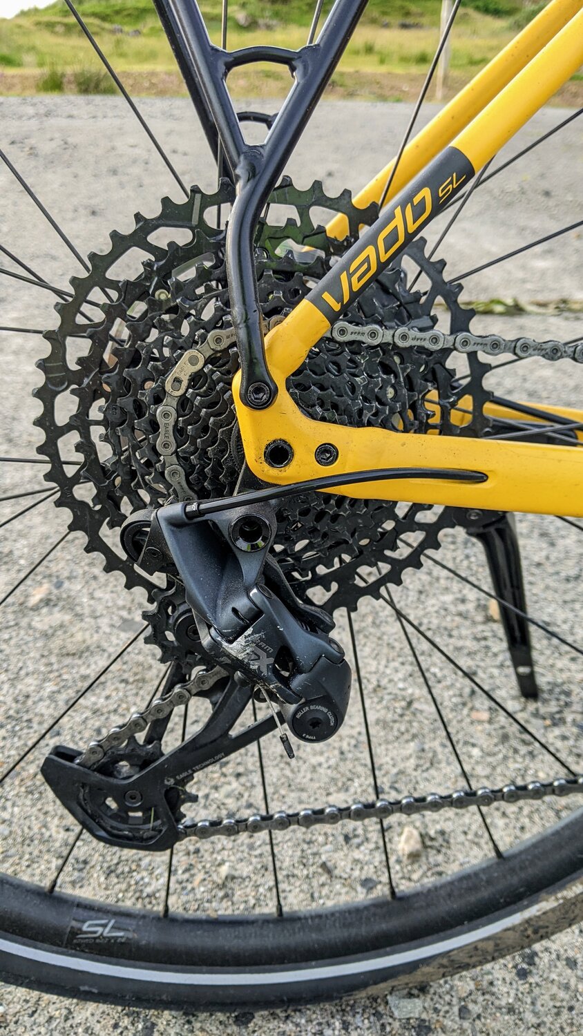 My evening ride today included a low speed crash. Although I thought nothing was damaged (on the bike ... my elbow is sore!) the indexing of the gears was clearly a problem. Closer inspection of the rear mech shows that it is now out of alignment. There's damage to the outside of the mech and the cage and rollers are bent inwards. The bike is rideable (I did another 35 km after falling off) but I clearly need to get it fixed.