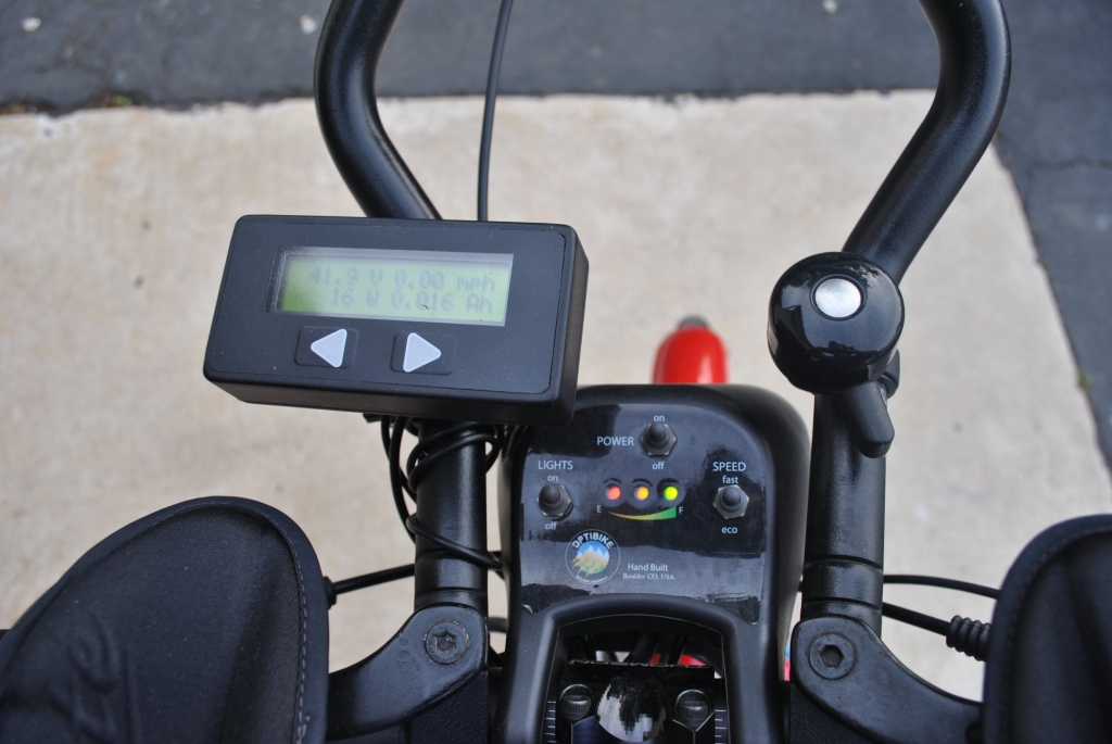 2008 Optibike 850Li with aero bars, throttle, spare battery, LED lights, wired tail light and cycle analyst. circa 2010.