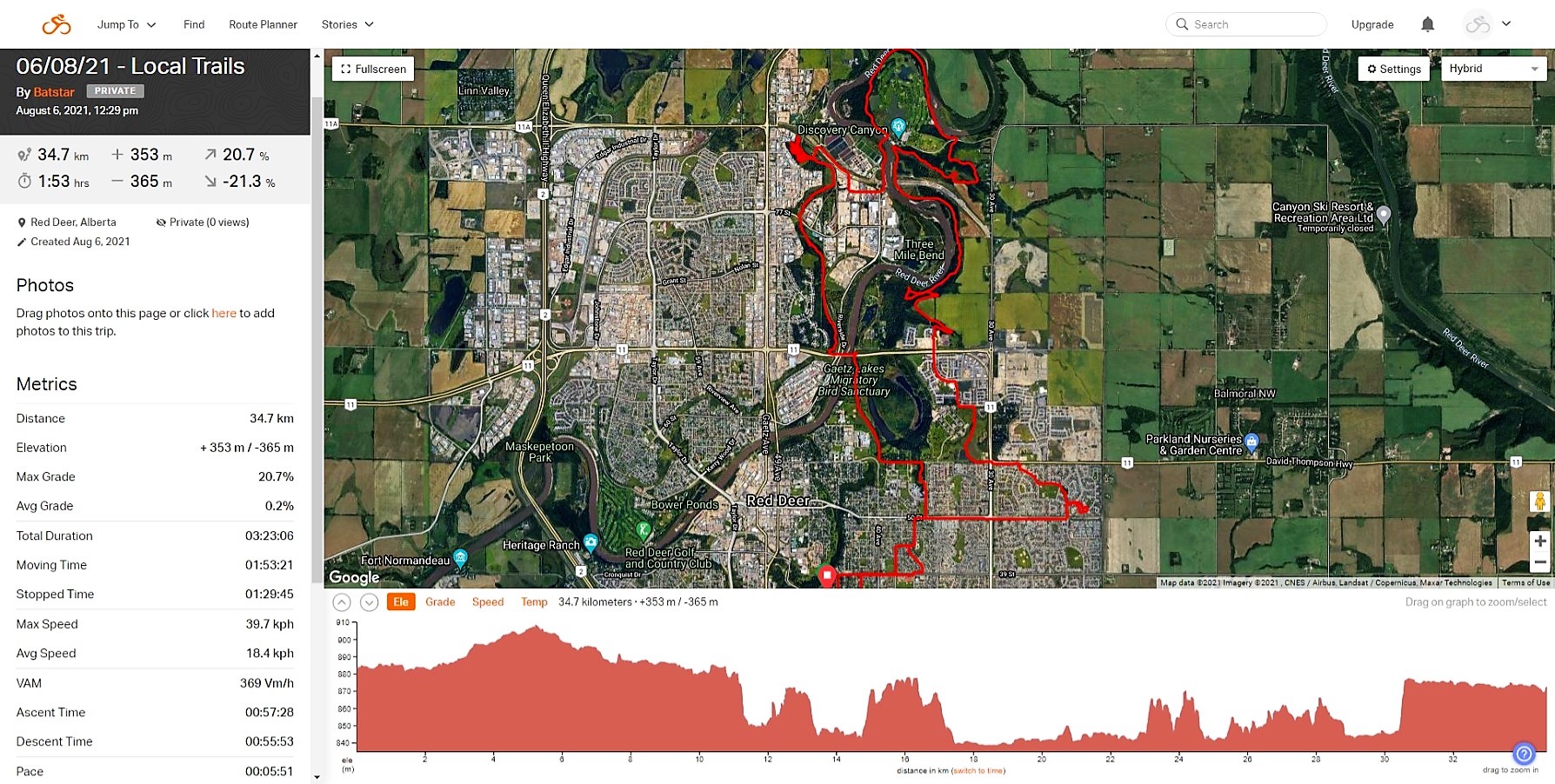 I transitioned over to trail mode yesterday as we rode the MacKenzie Bluff which happens to run along the east side of the Red Deer River. I’ve covered this trail before in previous posts but we decided instead to check out the lower section of the Bluff which can be notoriously muddy and sloppy even at the best of times. With almost arid conditions being the norm so far this summer, we took a gamble and decided to check it out. The gamble paid off and despite the usual roots and impediments which halted our progress on numerous occasions, the ride was relatively clean. It was difficult to stop and take photos at the time as I was straining to keep pace with my riding buddy Kelvin and only managed to snap this slightly blurred image of one section of the trail. We managed to eventually work our way up to the top section of the bluff and carry on. We completed the ride with usual outings at the MTB park and The Pines.