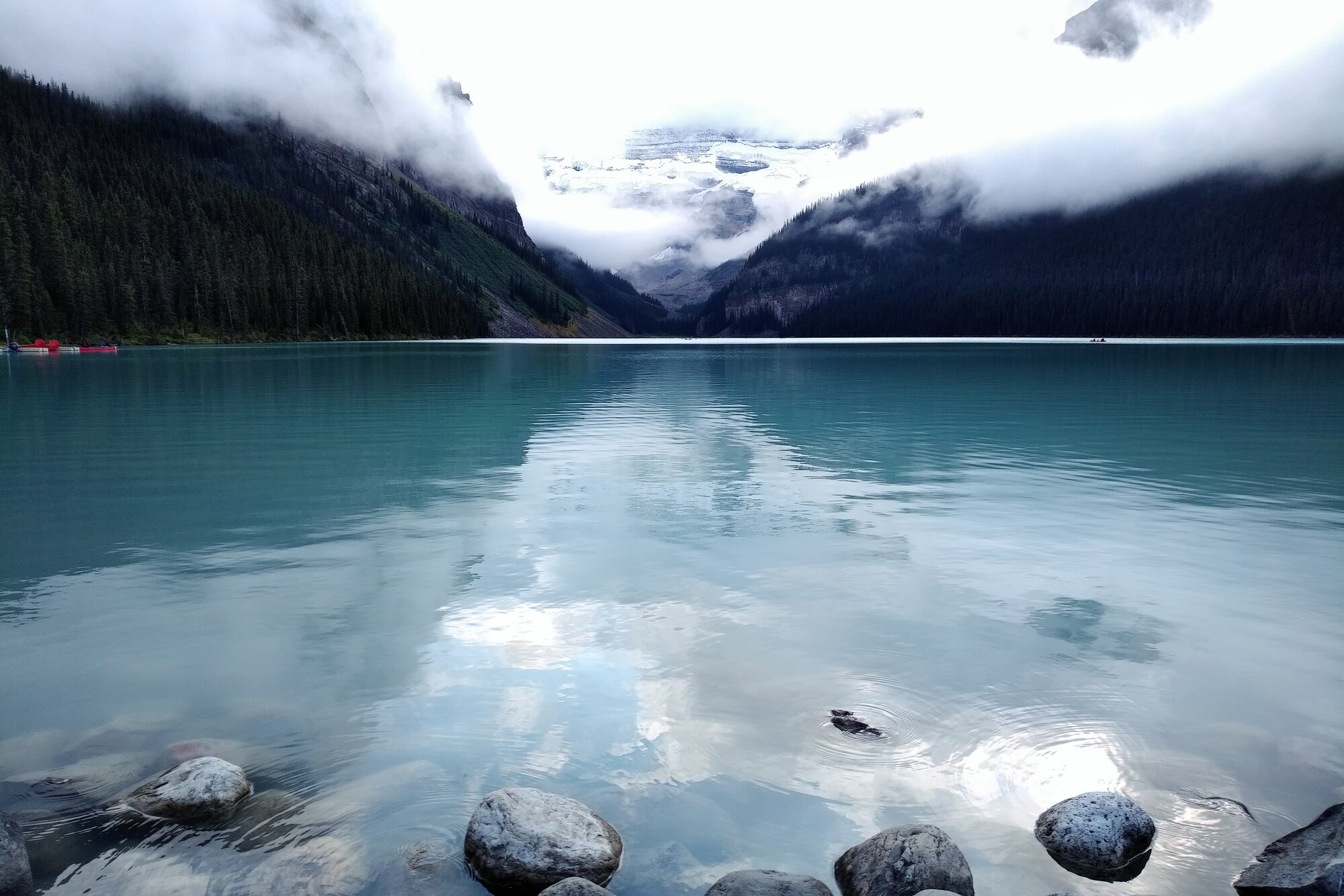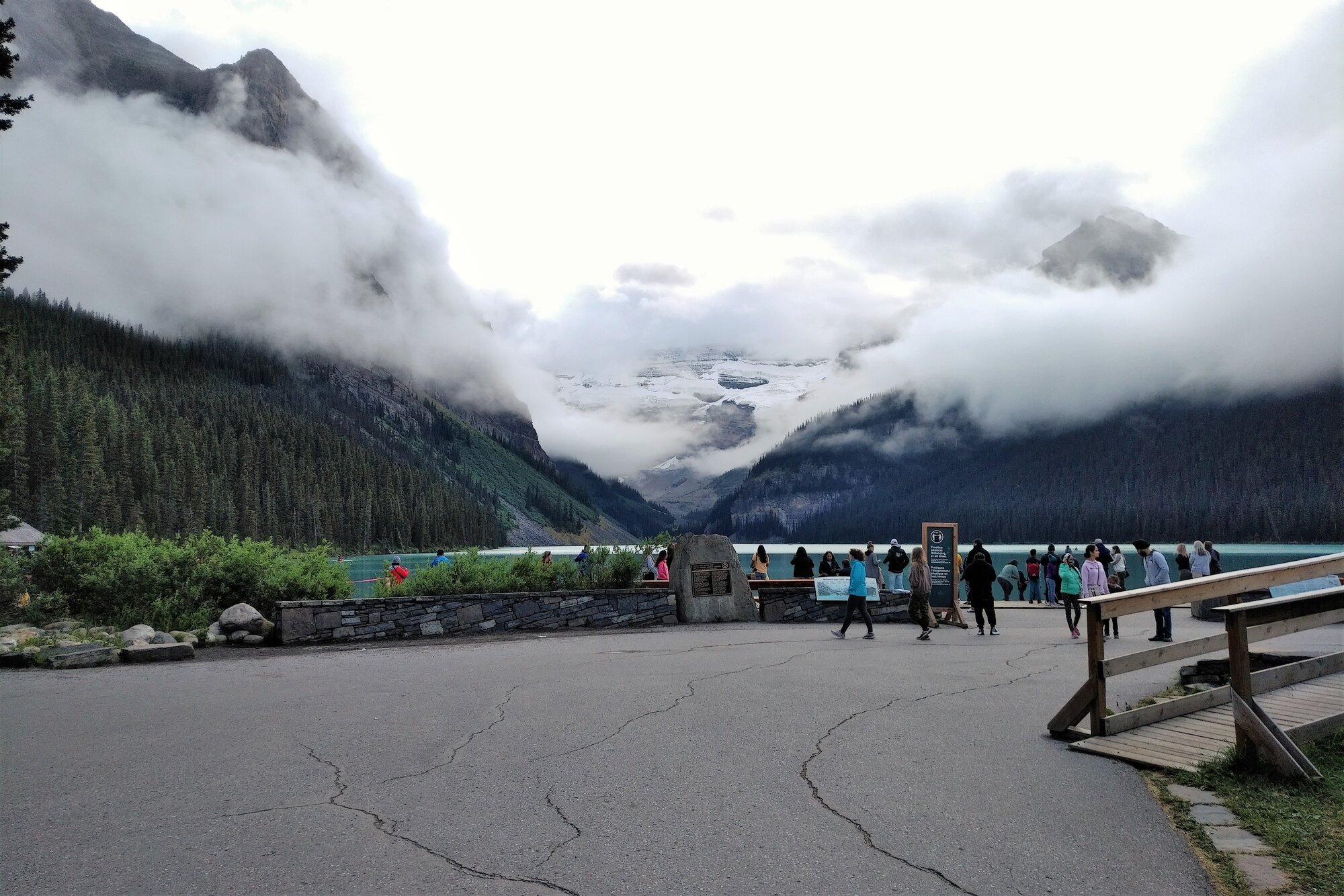 Realizing that we would be pressed for time in the morning, we decided to spend part of our evening with a casual stroll down to the lake. Upon our arrival, thick clouds hung over and enshrouded Mount Temple foiling an otherwise idyllic setting.