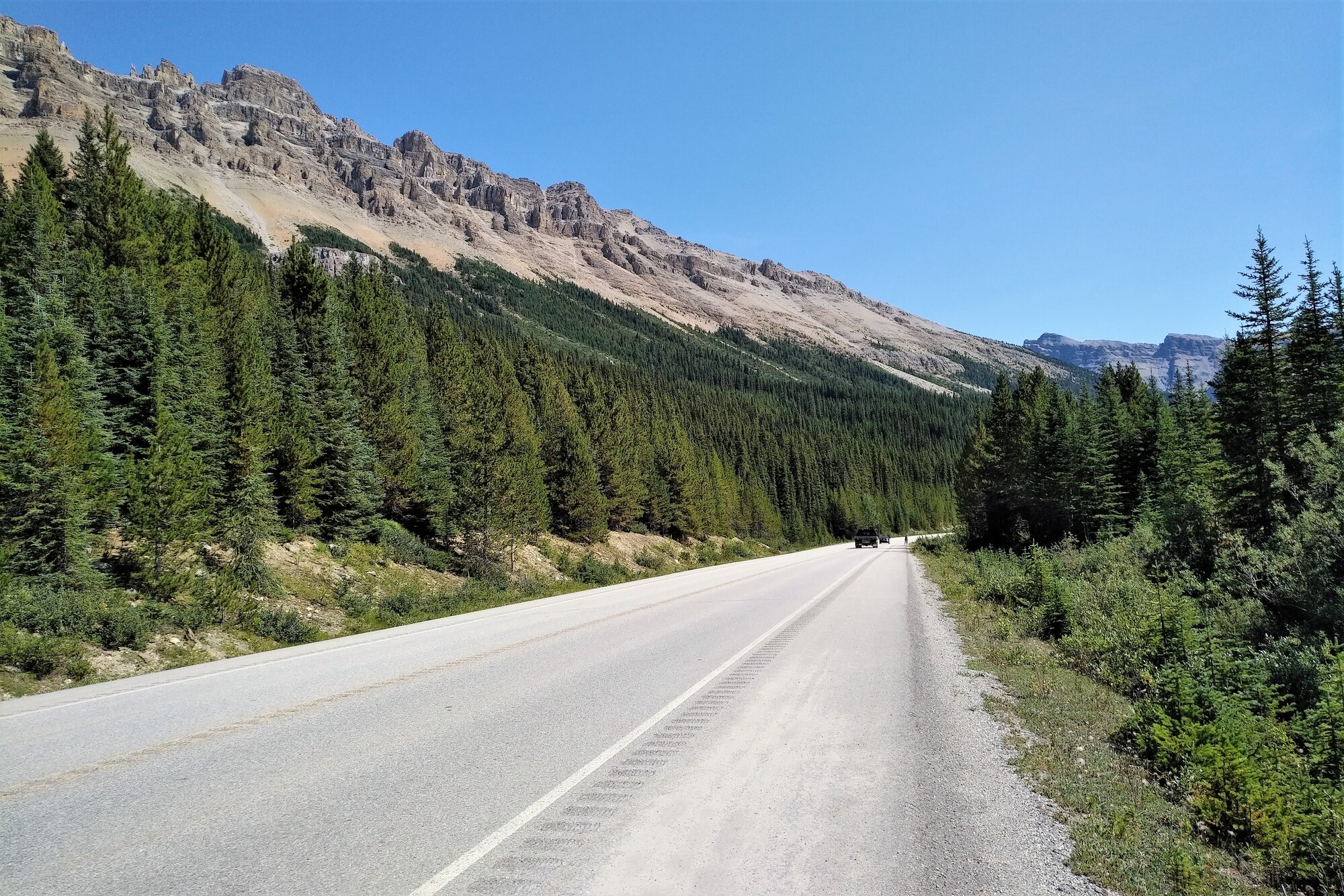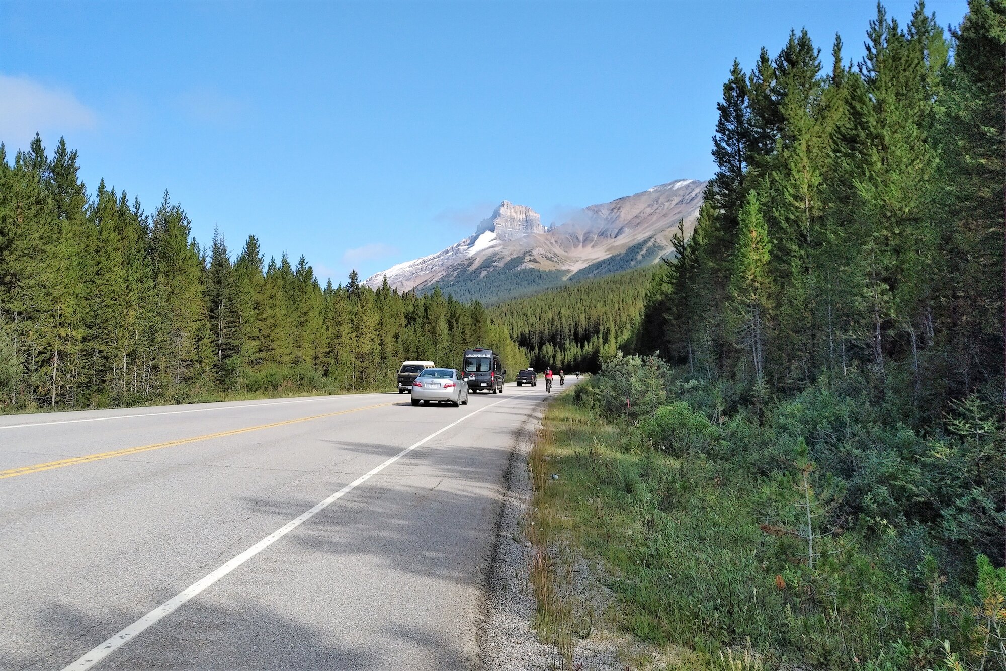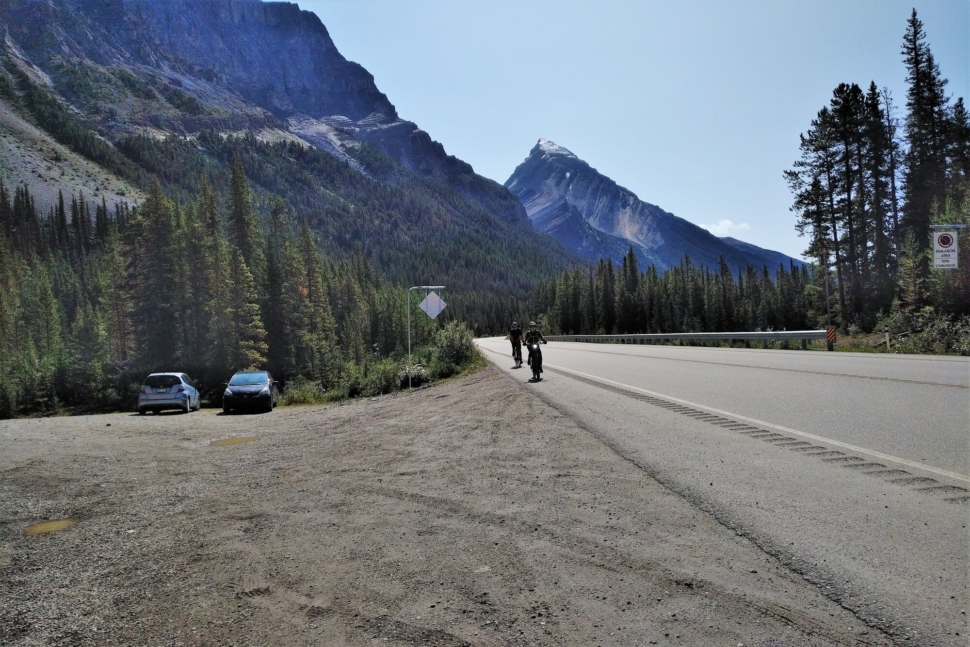 Yesterday’s ride, once again, took us out along the Icefields Parkway as we braved a chilly AM push off from Lake Louise. By the time we left, the mercury had only risen from 2C to 5C and our decision to bundle up and add an extra layer or two was a prudent one as the sun wasn’t expected to make an appearance until close to noon hour. The peak summer traffic, as expected, was heavy at times and was the only downfall to an otherwise spectacular outing on the bikes.
