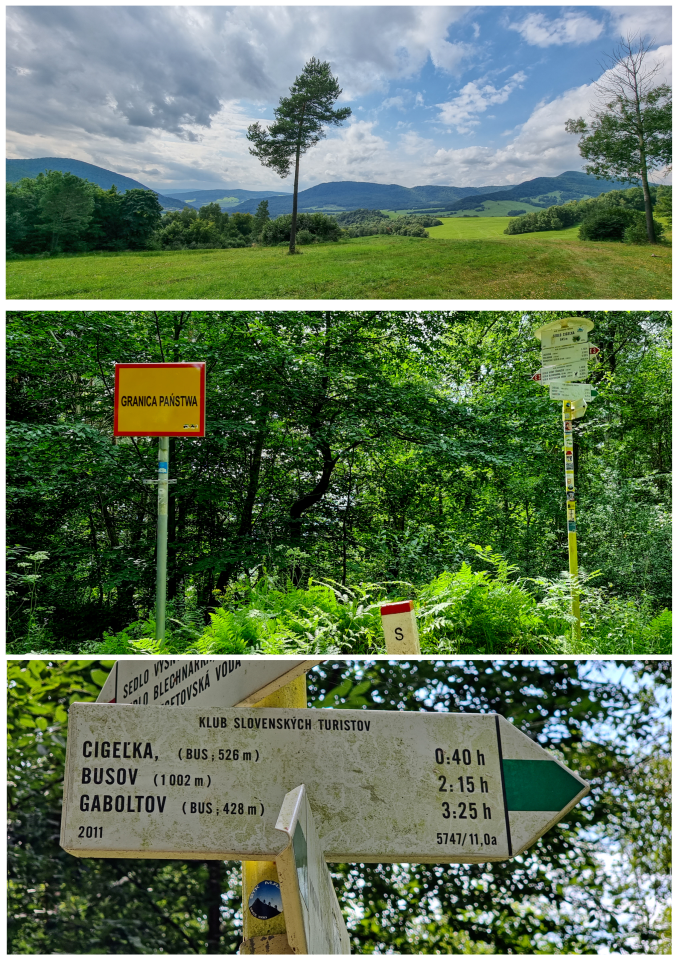 A beautiful sight appeared in front of me. I rode along the border, got into forest. Negotiated mud and puddles. Walked. Rode. Walked. To reach the summit of Mt. Cigeľka (Little Brick) with the border sign and direction signs.