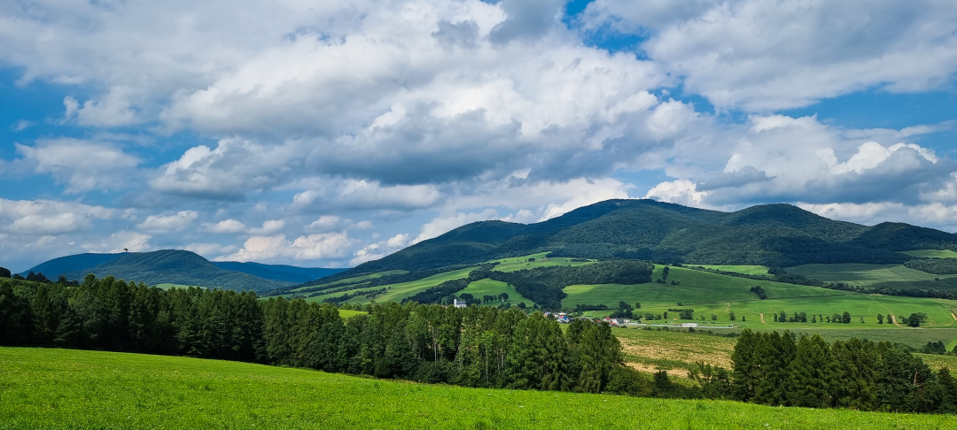 What a view! Left: Busov Massif. Right: Lackowa Massif. Far forward: Beskid Sądecki. Near forward: The mountains I had to ride soon. Small hill in the foreground hides the village of Cigeľka.