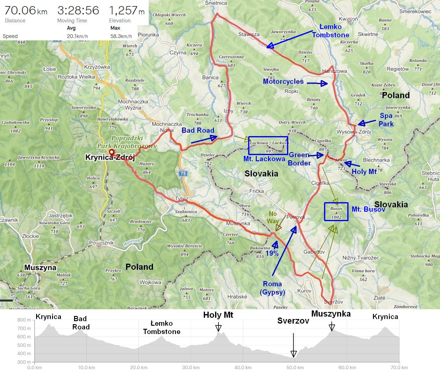 Although Slovakia sports wonderful landscapes, I am not fond of her inhabited areas. My GPS navigation told me to cross the hills by MTB trail. No way! (Only now I could discover my route-planning mistake). So I quickly re-planned my route and zoomed southwards by roads. (I should be at the parking lot in Krynica before 6 pm!)