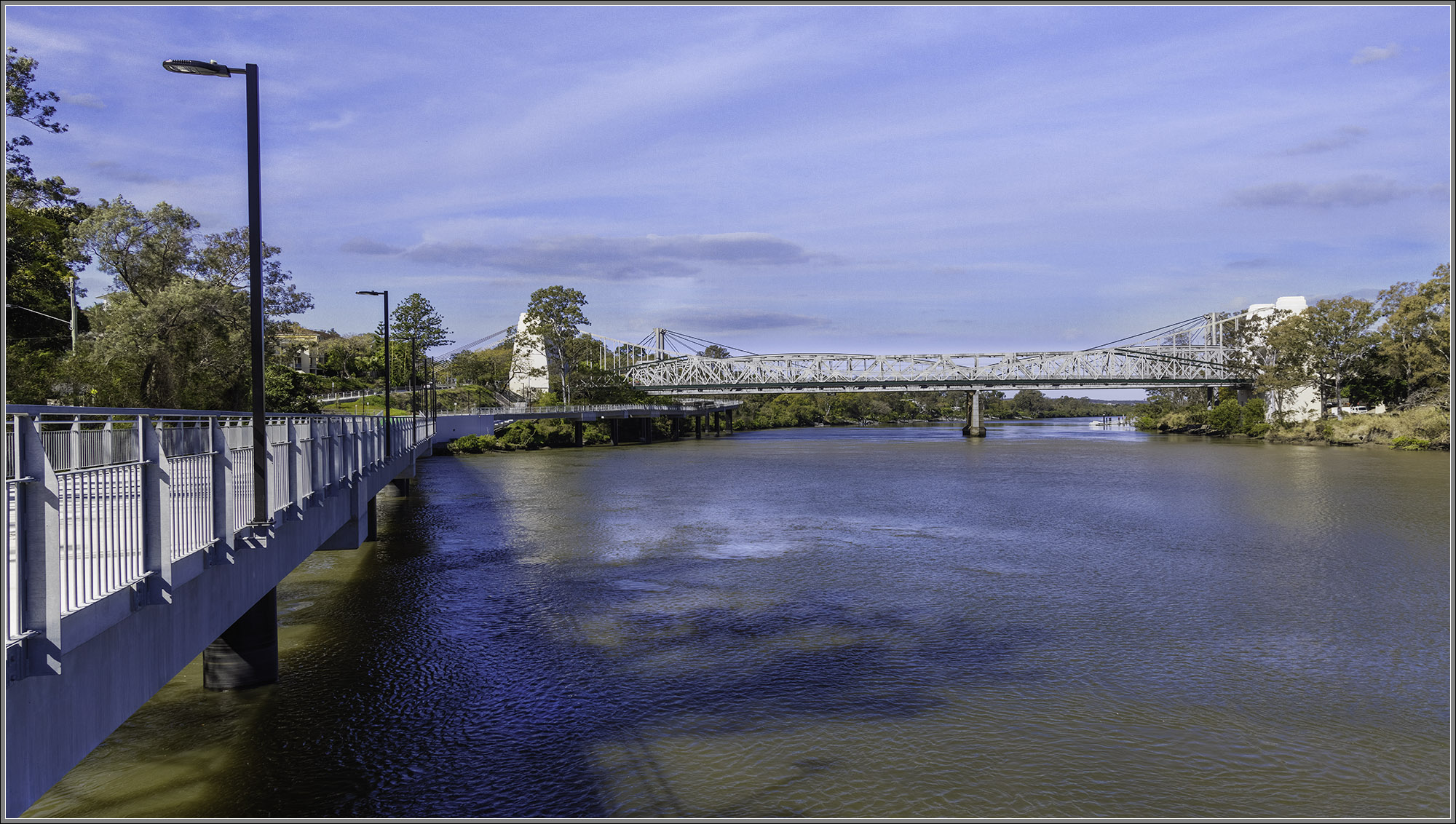 Seeing double? A new style of bridge? As is so often the case around the world, one bridge follows another. Closest to us is a 1920s suspension road bridge with concrete towers which, until 2010, had multi-storey apartments within. Furthest away is twenty-first century cycle and pedestrian suspension bridge. Between the suspension bridges are steel girder rail bridges (one rectangular, the other arched).