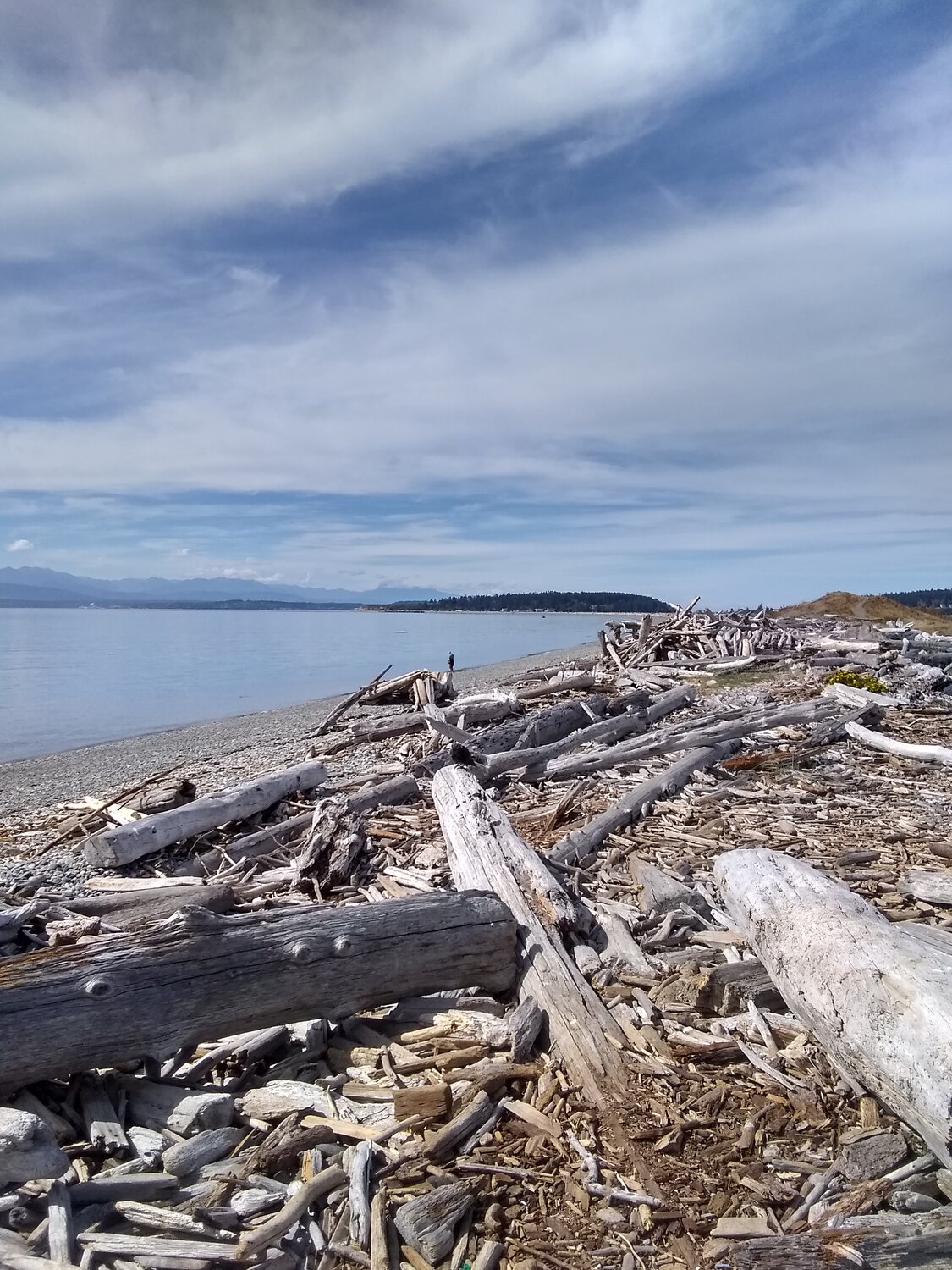 Continuing along, arrived at the western coast of the island, just south of the Keystone ferry landing. The stone beaches are littered with driftwood: