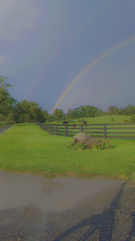 The horses in the fields seemed quite nonchalant about their wet coats as they continued to graze under the arc a beautiful double rainbow. Somewhere beyond those trees was a pot of gold. Maybe two.