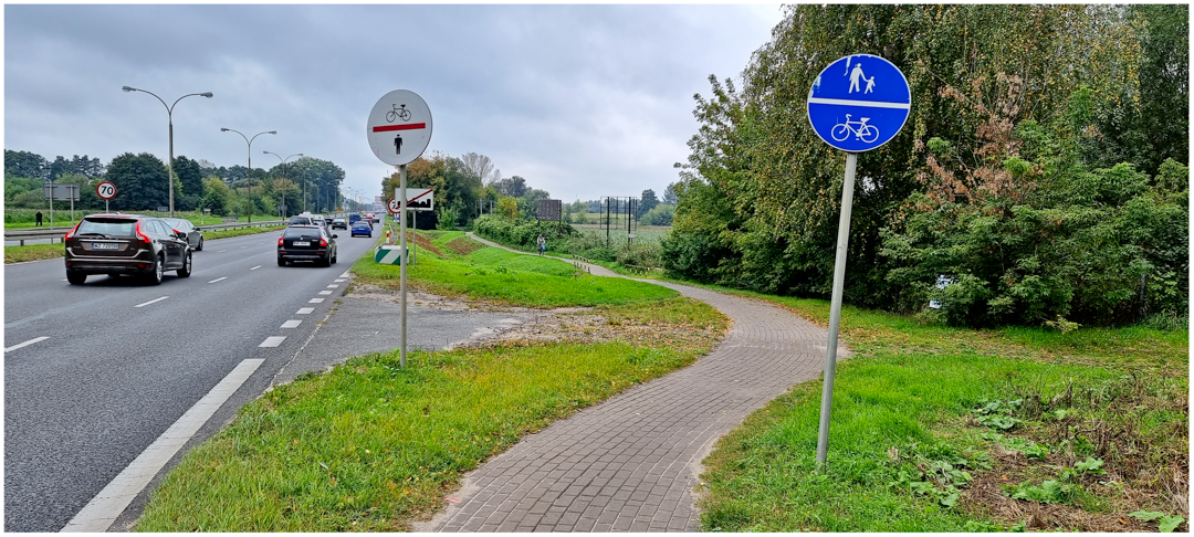 One of the worst cycling spots in the Warsaw suburbs. The bike path is just hopeless but you are not allowed to ride with traffic there. If I ride my S-Vado, I just ride with traffic (it is OK and even not dangerous). When on a bike (that is, a 25 km/h Euro e-bike), I have to take that bike path, (so I avoid that area whenever I can).