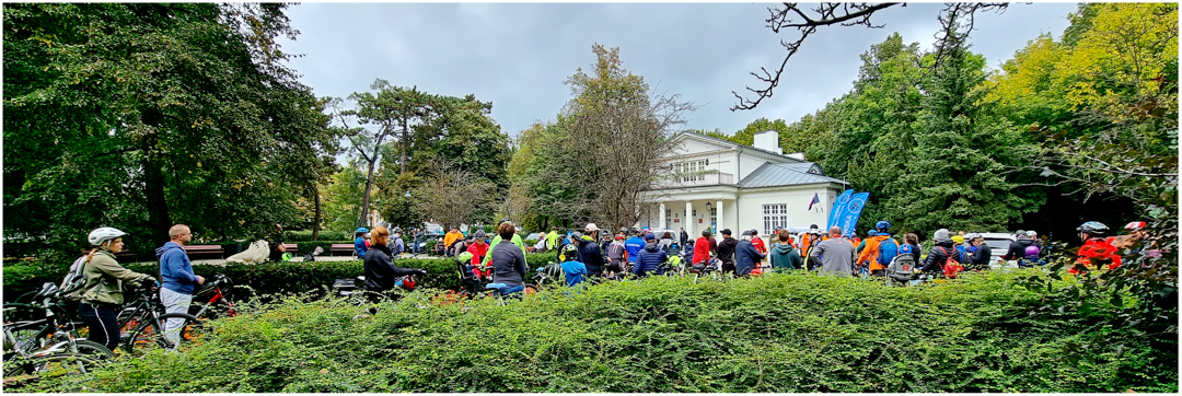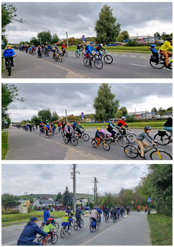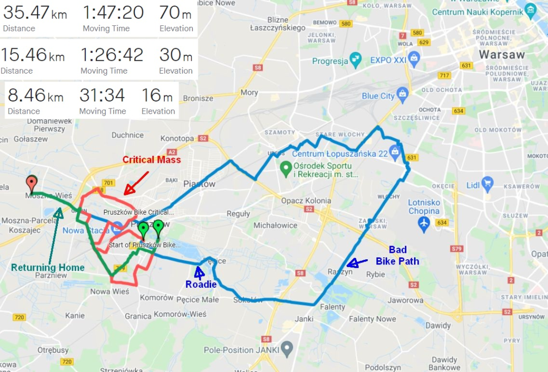 I liked the parade. Moving at the slowest speed possible (some 10 km/h), it had to be done in the lowest gear. I rode with no electric assistance although I admit I turned it once for a while. I made a furore in the eyes of two attractive female cyclists by showing them pedalling at 140 rpm cadence: "Now, that's some spinning!" one of them remarked in aweI admired little kids, effortlessly having ridden for 15 km on tiny kid bikes. Yes, Poland is a cycling country. (Pruszków is only a 60,000 county town but the number of cyclists who gathered was significant). Notice organizers in orange vests: they actively participated in "corking" of intersections.