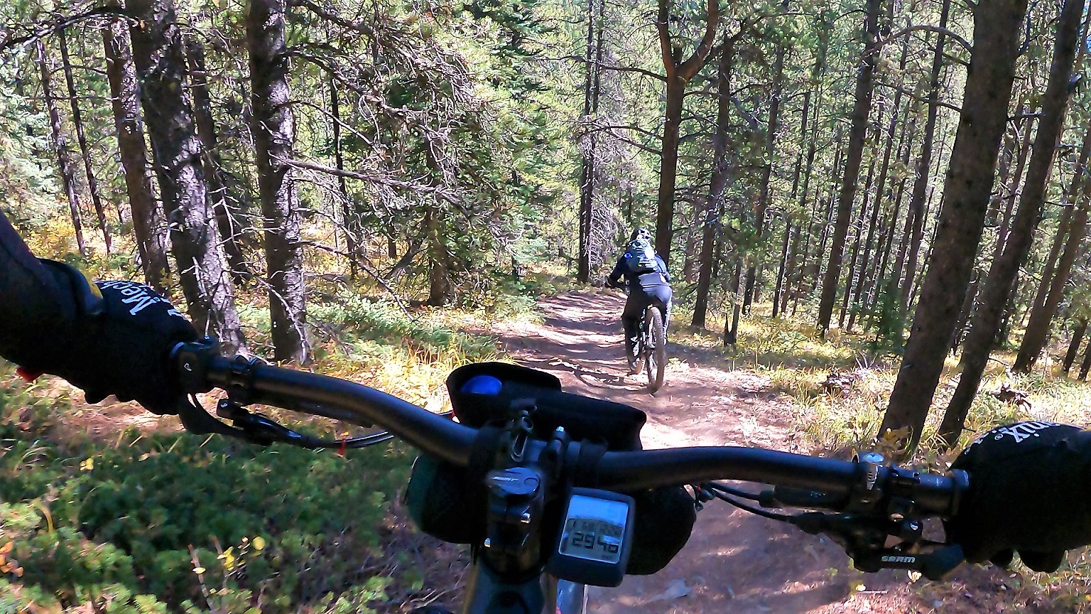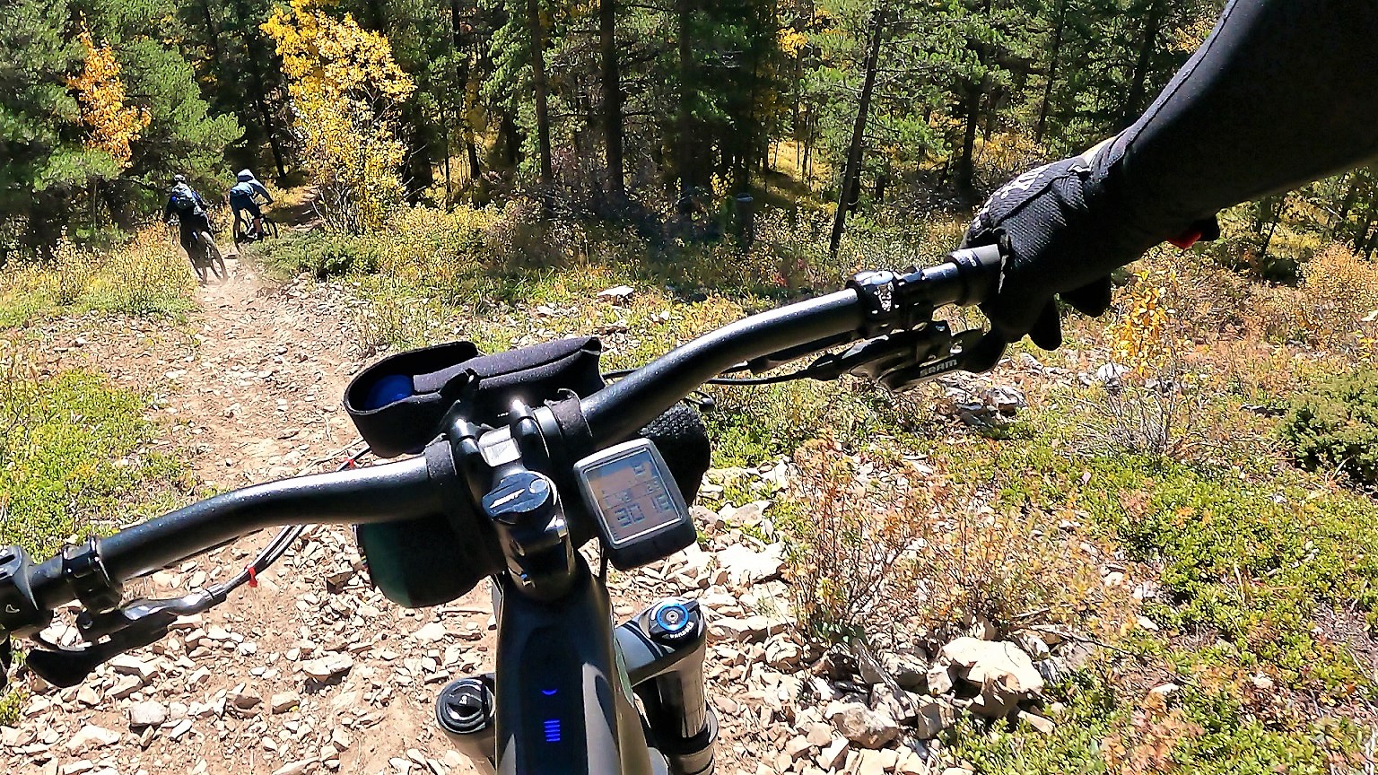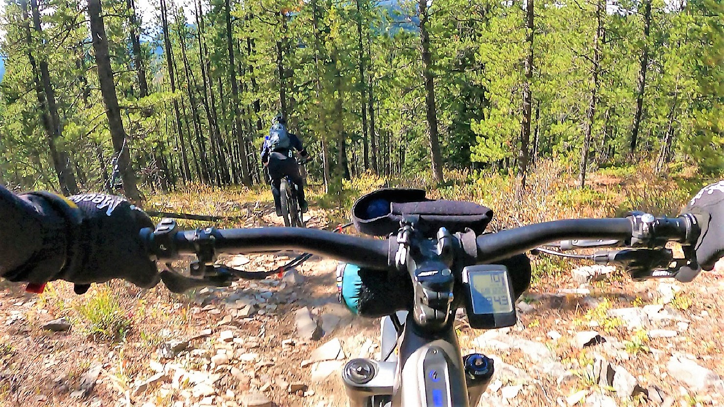 Further up the trail: the right-angle turn between the two riders pushing their ebikes (using walk mode?) is a problem spot: cut the corner and encounter a monstrously steep slope (albeit for no more than a few metres), or go wide and spin the rear wheel on the gravel.