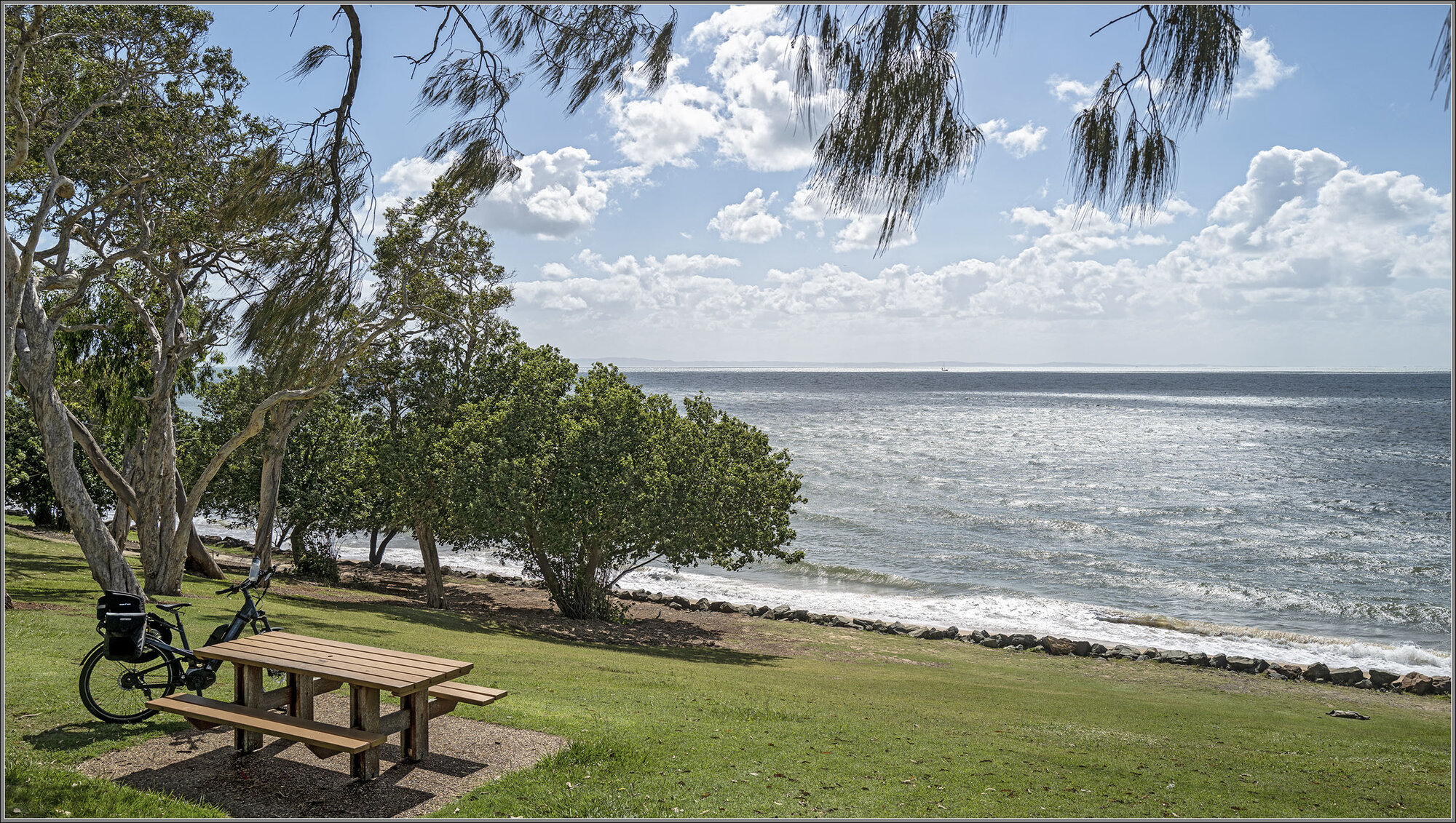 Maybe I wan't such a good idea to head up the bay today. The wind was fresh and from the SSE, which is to say behind me. Of course, sea breezes are fickle so there was little assistance for the first hour or two; however, when I crossed the three-kilometre viaduct to the Redcliffe Peninsula the vibrating slats on the cycleway's safety barrier were humming a warning which was reinforced by the thorough buffeting meted out as the trail arced around the southern, that is unprotected, end of the peninsula. Uh, oh!