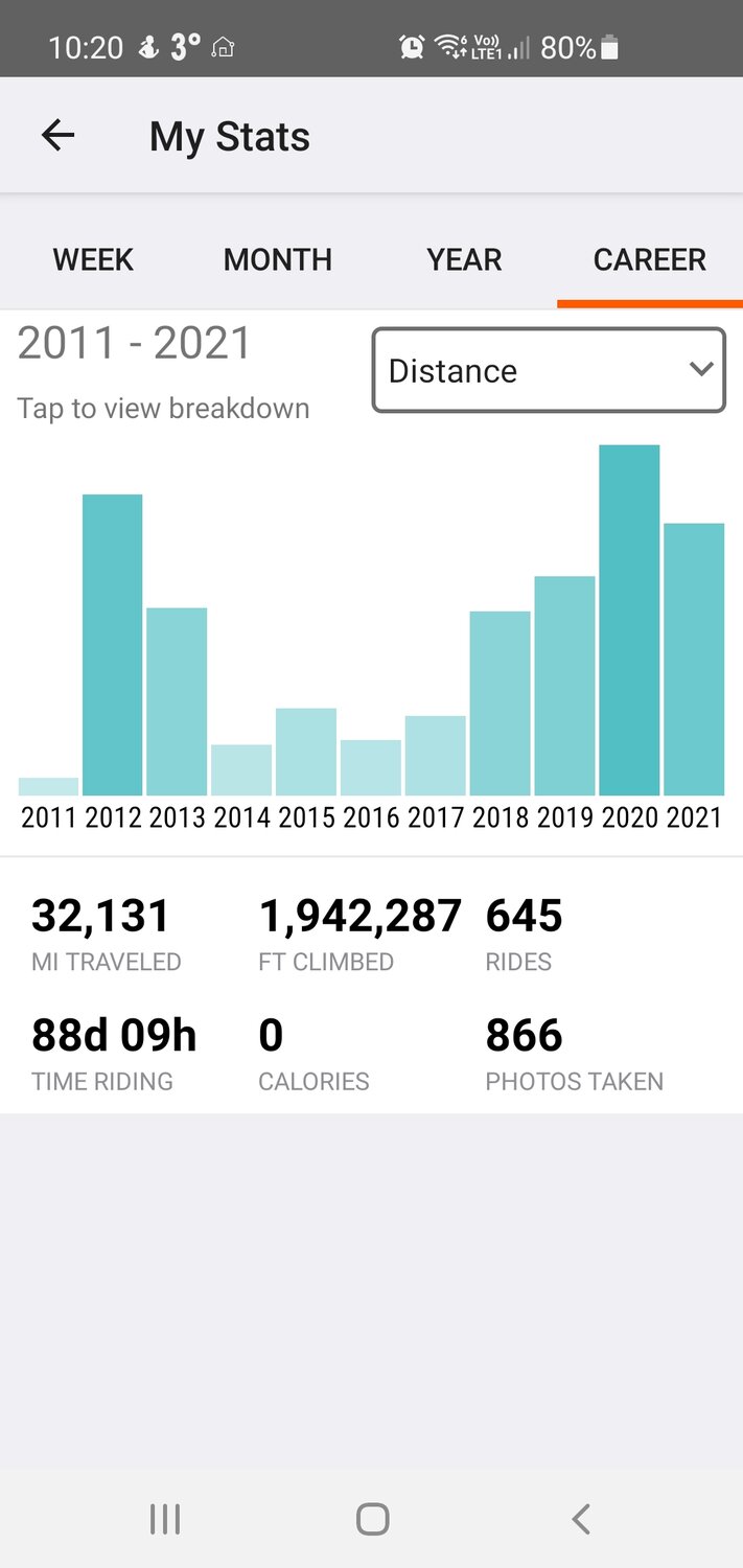 In 2020 along came the pandemic and I was furloughed from work, thankfully we were allowed to go out for exercise so I made the most of it with a total of 6223 miles from 151 rides with an average of just over 41 miles! This year my dad's health has deteriorated so I have been forced to cut down, still managing 4843 miles so far from 113 rides with an average of almost 43 miles! Hopefully I can get to 5000 miles before the year end, I just need the weather to play ball...what an amazing few years I have had with this amazing e bike!
