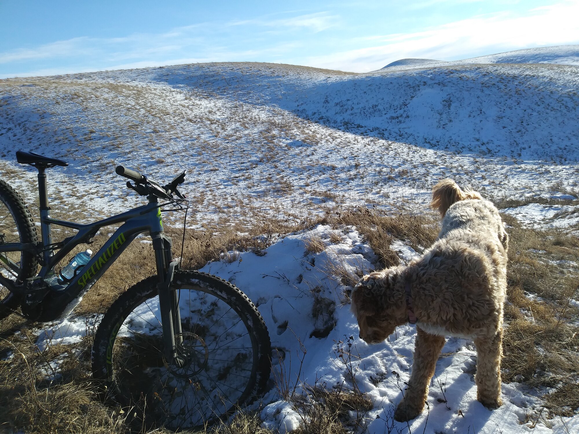 What a swell place to go out on a ride with the pup despite having that close call. We received a few cm of snow last night which was a welcome sight.Randall - going to follow your adventures on the Intrigue as a family member was going to purchase one but by the time a decision was made our LBS was sold out of them . . . today's ride could be called "Fire in the Hole" or what the heck . . . about a mile north of our house is a series of hills that I often take the Golden Doodle to run off some of her never-ending energy - there is never a person around just a good habitat for deer, fox and so forth, today to my astonishment I met a fellow in all white camo carrying a long range rifle (and hunting season is over here) who was upset that my dog and I crested a hill that he had a target there for shooting long range (600 metres) - I had spotted his truck at a gas well and thought some maintenance was going on - guess not - we had a long chat and he promised to call before future shooting events but my little biking paradise won't be quite the same in the future, picture has a fox den hole holding the Levo up and "Missy" concerned about what might be in the hole under the bike . . .View attachment 109121