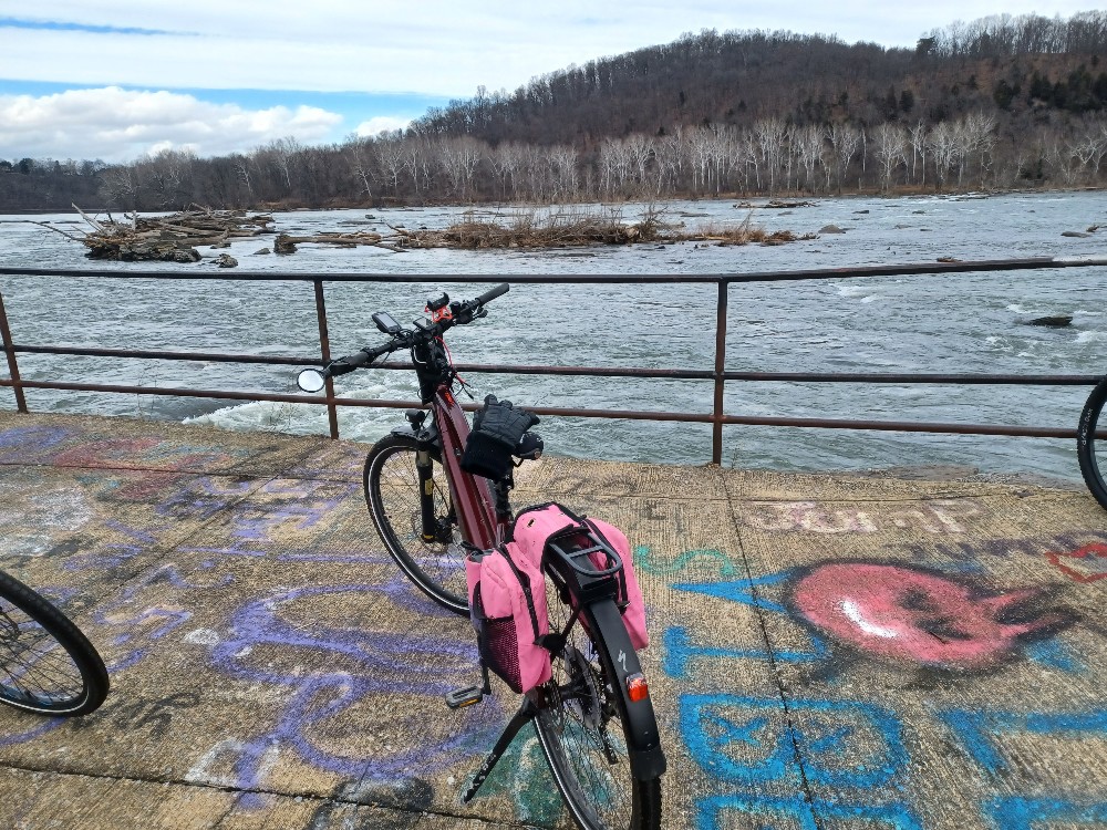 Our weather here in northern Virginia has been the proverbal "hot and cold", flip flopping at random, raising eyebrows as well as interest in getting out of the house and onto the bikes. As luck would have it, the Washington DC ebike group had a 27 mile ride this past weekend out in West Virginia (another state altogether that shares a mountainous border and some rather large rivers) with Virginia) to visit Harper's Ferry, a National Park where the great Potomac River met the just-as-great and pehaps more famous Shenandoah River, both bodies of water named by the native American Indians who are now long gone. A "special secret" entrance into the park was promised by the ride organizer, an entrance where only hikers and bikes were allowed. This, and the day's warm weather, was a great incentive to toss the bike on the car's rack and enjoy an hour's drive to Almost Heaven West Virginia. (A not so subtle nod to the late John Denver's well known song "