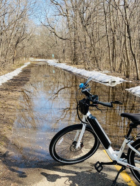 First ride of the season was mostly wonderful except for a couple sections of mud and huge puddles. Didn't want to risk going through them as I didn't know the depth or what lies beneath. And I didn't want to get my pretty white ebike dirty! Went to the left side to get around this mess.