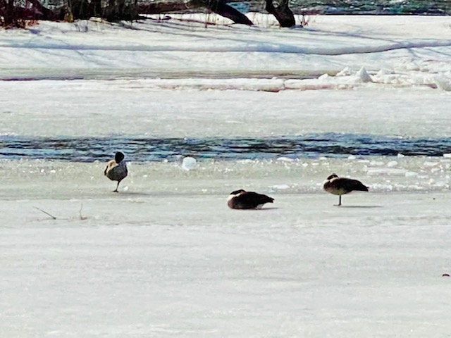 Some Canada Geese on a mostly frozen pond. Pretty amazing that a bird of this size is able to stand on one leg.