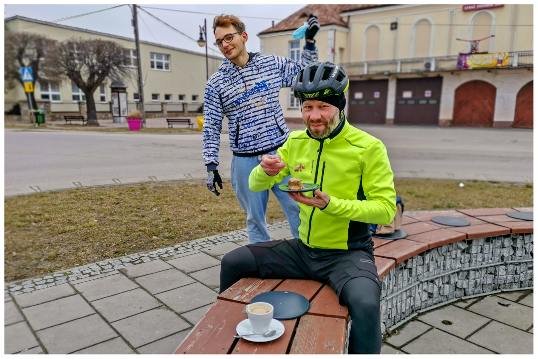 The westward trip leg meant riding into significant headwind. At some point I couldn't stand the thought of the Gang suffering. I rode to the front and shouted "Ride behind me!" Przemek was giving me speed and route directions from behind me, and the peloton was properly drafting ;) Przemek made the pack ride into the woods... Frozen and melting puddles, bumps, mud. Ania was riding her