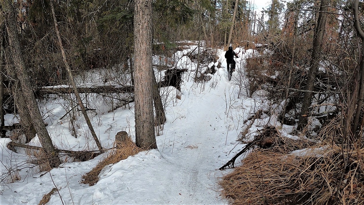 As expected, he blew me off on the single track runs at both Heritage Ranch and The Pines as we eventually made our way out to Riverbend via this more technical route. I was never able to catch up to him regardless of how hard I tried. Kelvin is a former dirt biker and his skill set in negotiating the narrow trails is obvious in the video footage. Skiing every week likely helps with his conditioning. I wisely took his suggestion of actively using only rear braking when cornering which allowed me to pivot/slide the rear end out for quicker exits on the narrow and twisty sections. Unfortunately, the snow on both sides of the trail made it particularly challenging. Once you're in the deeper stuff, you're stuck. :rolleyes:
