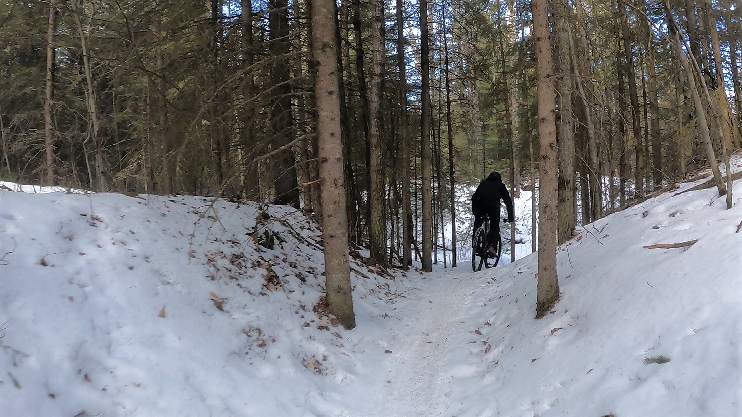 As expected, he blew me off on the single track runs at both Heritage Ranch and The Pines as we eventually made our way out to Riverbend via this more technical route. I was never able to catch up to him regardless of how hard I tried. Kelvin is a former dirt biker and his skill set in negotiating the narrow trails is obvious in the video footage. Skiing every week likely helps with his conditioning. I wisely took his suggestion of actively using only rear braking when cornering which allowed me to pivot/slide the rear end out for quicker exits on the narrow and twisty sections. Unfortunately, the snow on both sides of the trail made it particularly challenging. Once you're in the deeper stuff, you're stuck.