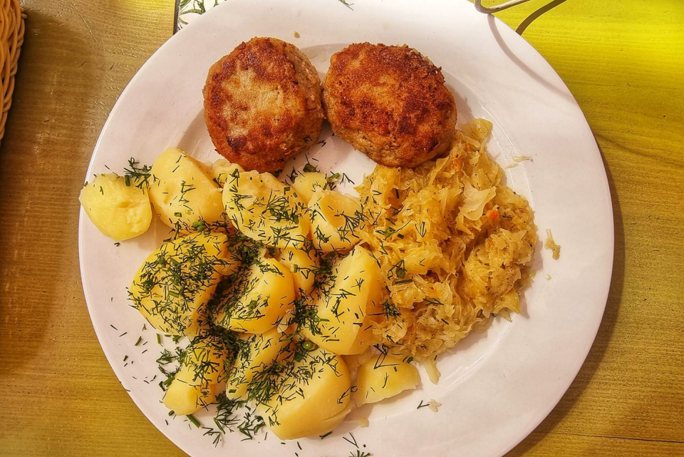 In the "Inn Under A Thatched Roof" (Karczma pod strzechą). Meatballs, potato, fried cabbage. Very Polish and as good as any Polish mother could make!