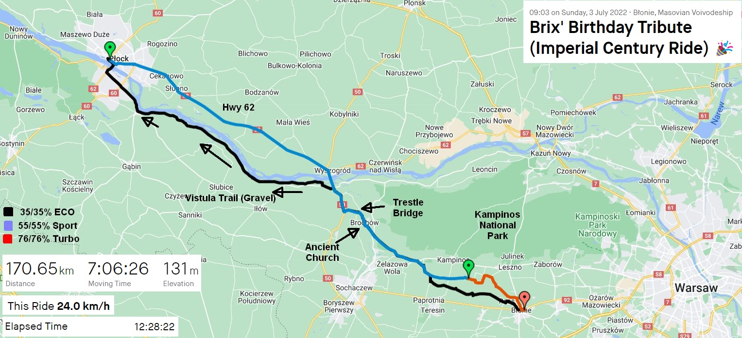 I was sure I left my elegant and expensive trousers in the wardrobe. However, the maid was on a well deserved leave, and nobody could tell me whether my pants actually were there! Pretty late (9:03 am) I started my "big" Vado ride from Błonie. I was fully prepared: taking all three batteries, a charger, and optimizing the route not to end up with a 200 km ride.