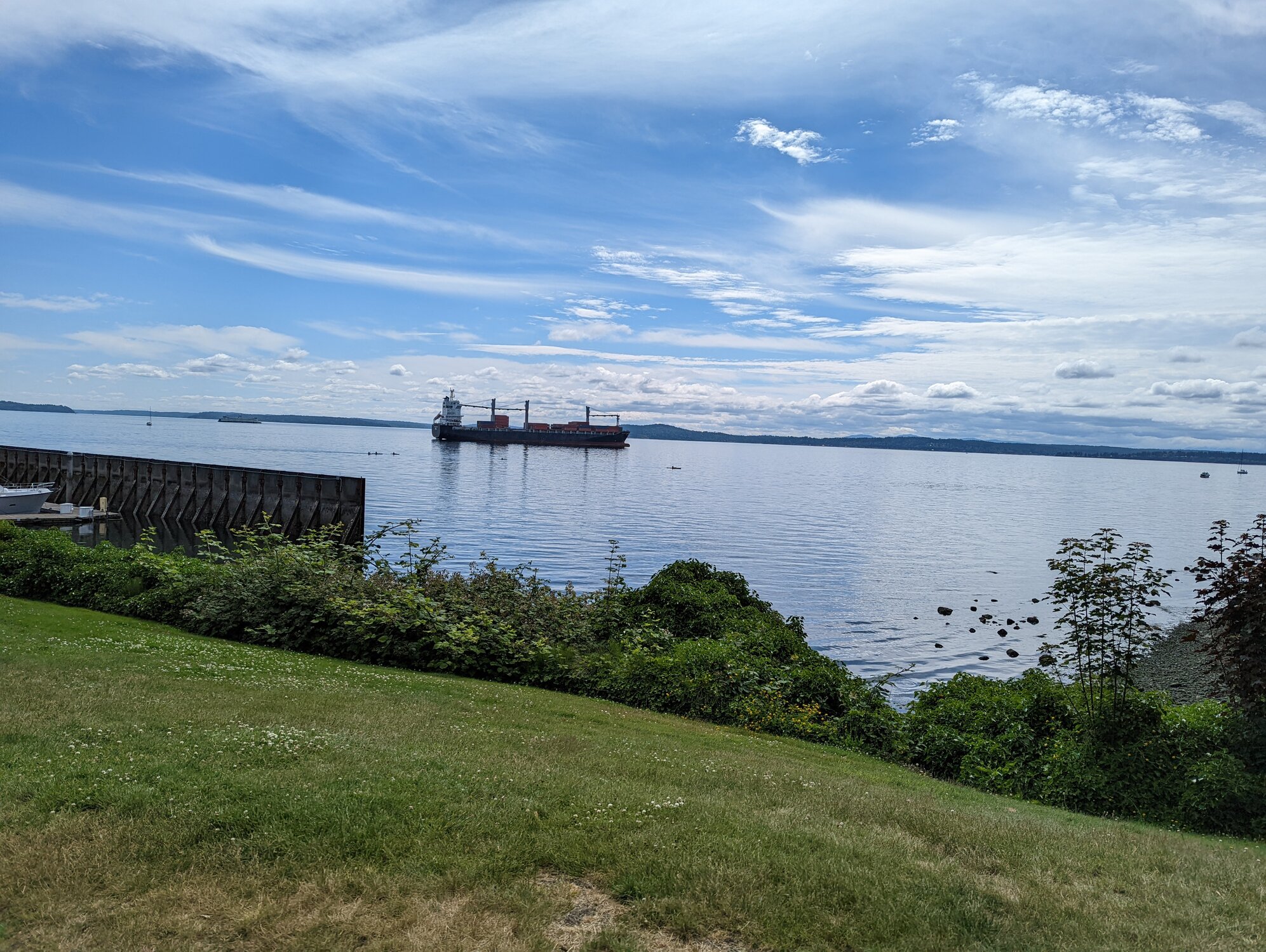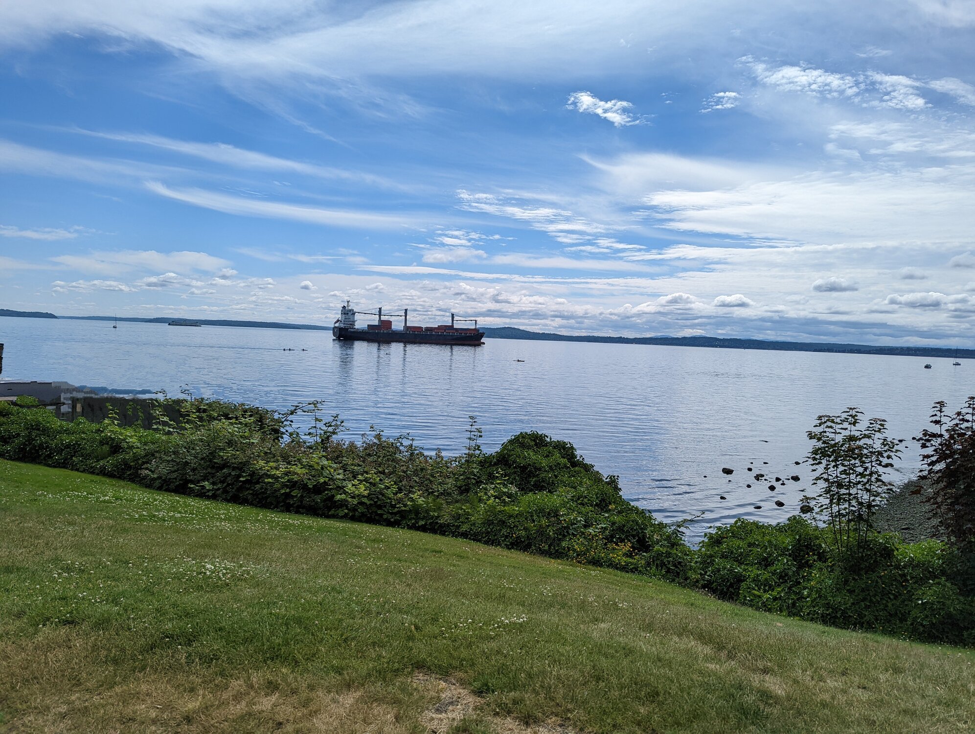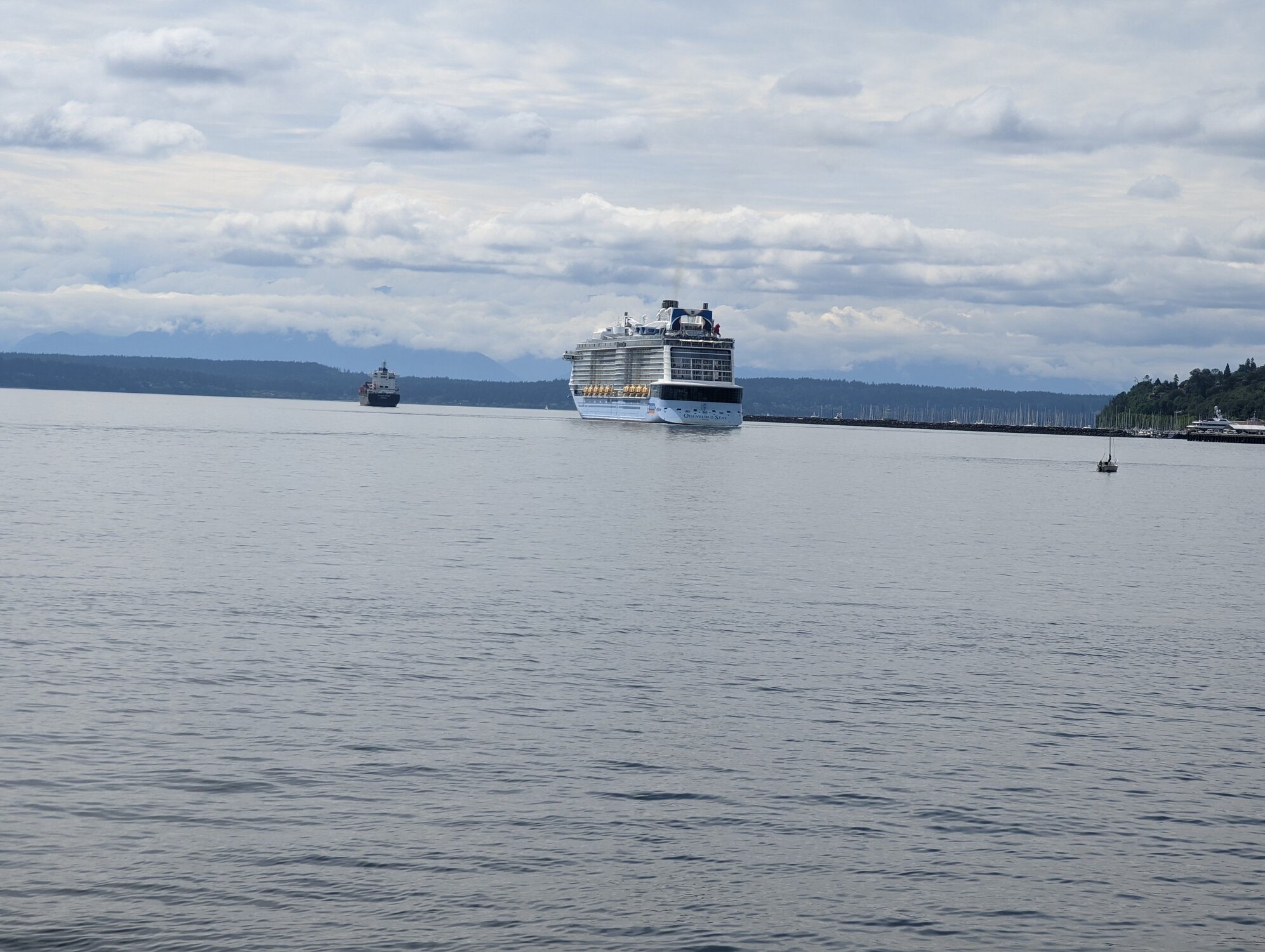 A cruise ship leaving for Alaska. It was docked as I passed it about twenty minutes earlier. With a slew of passenger along the rails and its horn was sounding.