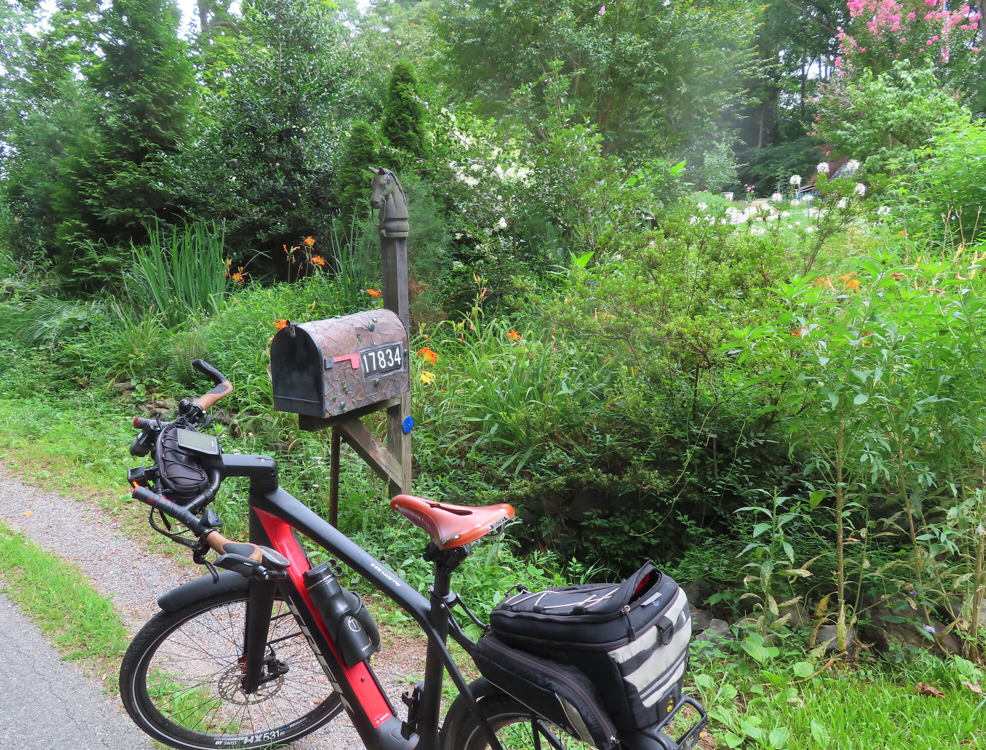 I shoved off this morning with the intention of beating the rain. A simple ten mile familiar circle I thought but at the five mile stop sign I went left up the hill rather than gliding down the right. Surprised myself, but who hasn't been there. Another turn is three or four miles away, and in the meantime there was this flowery driveway others here would capture to better effect. At Vontay crossing I shocked myself by turning right this time and quickly was gliding at 30mph on the deceptive descent like a magic carpet ride. Always the far way today...why was that? I rode easily for a couple of miles and then a peloton of five overtook me. I patted myself on the back for not pursuing. A little later another three crept by me and this time the dog came out. After passing them on a hill and gliding down the other side I missed another turn home. Okay, I'd stop at the post office, sit in the shade a bit and eat a power bar. Here I fretted about the missed turns. My mileage was creeping up.