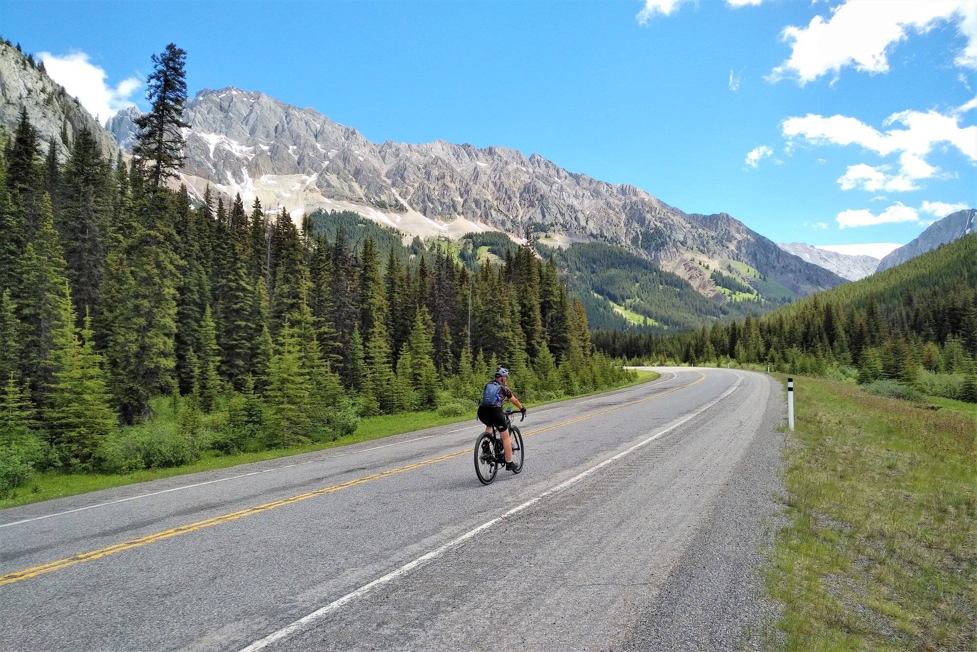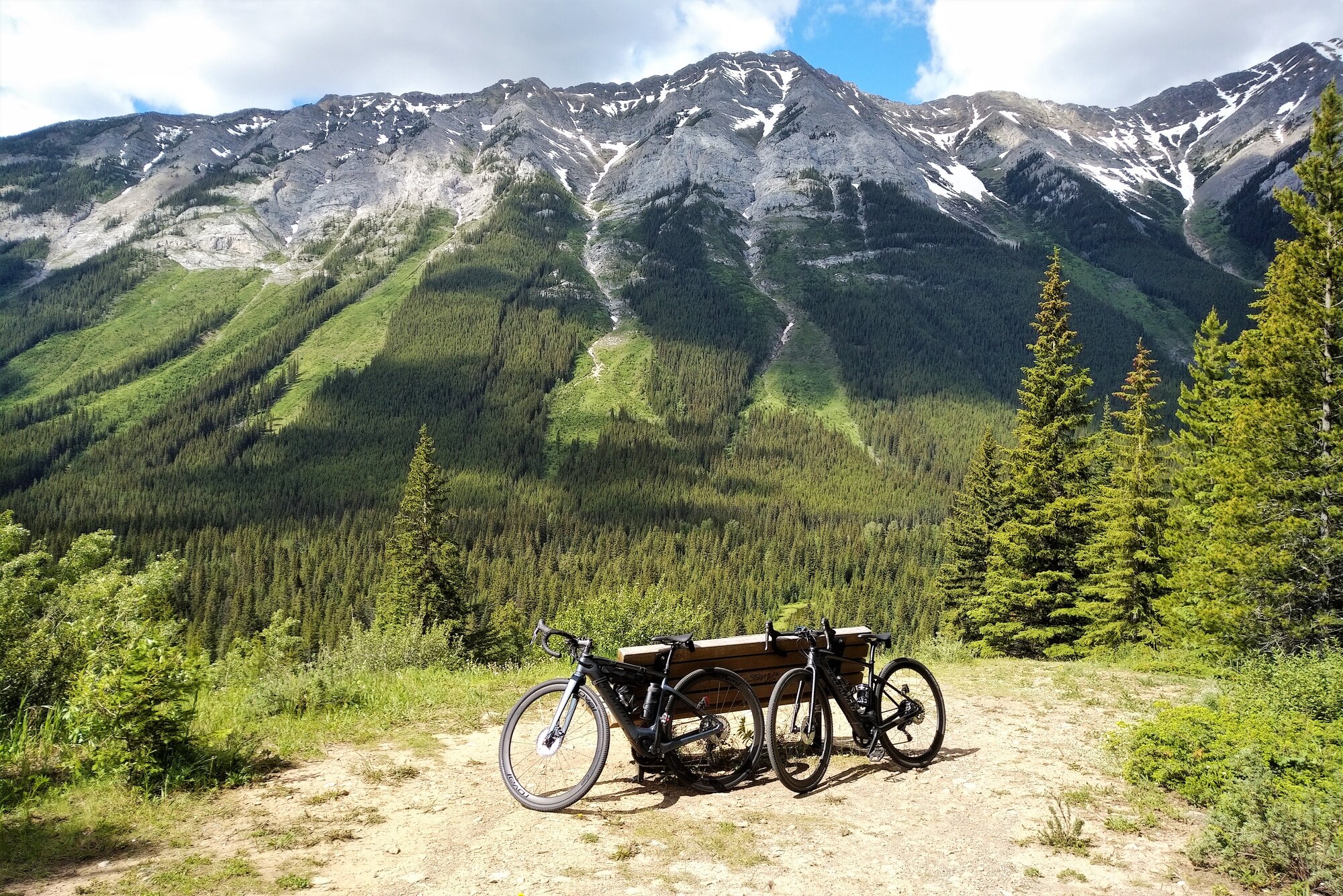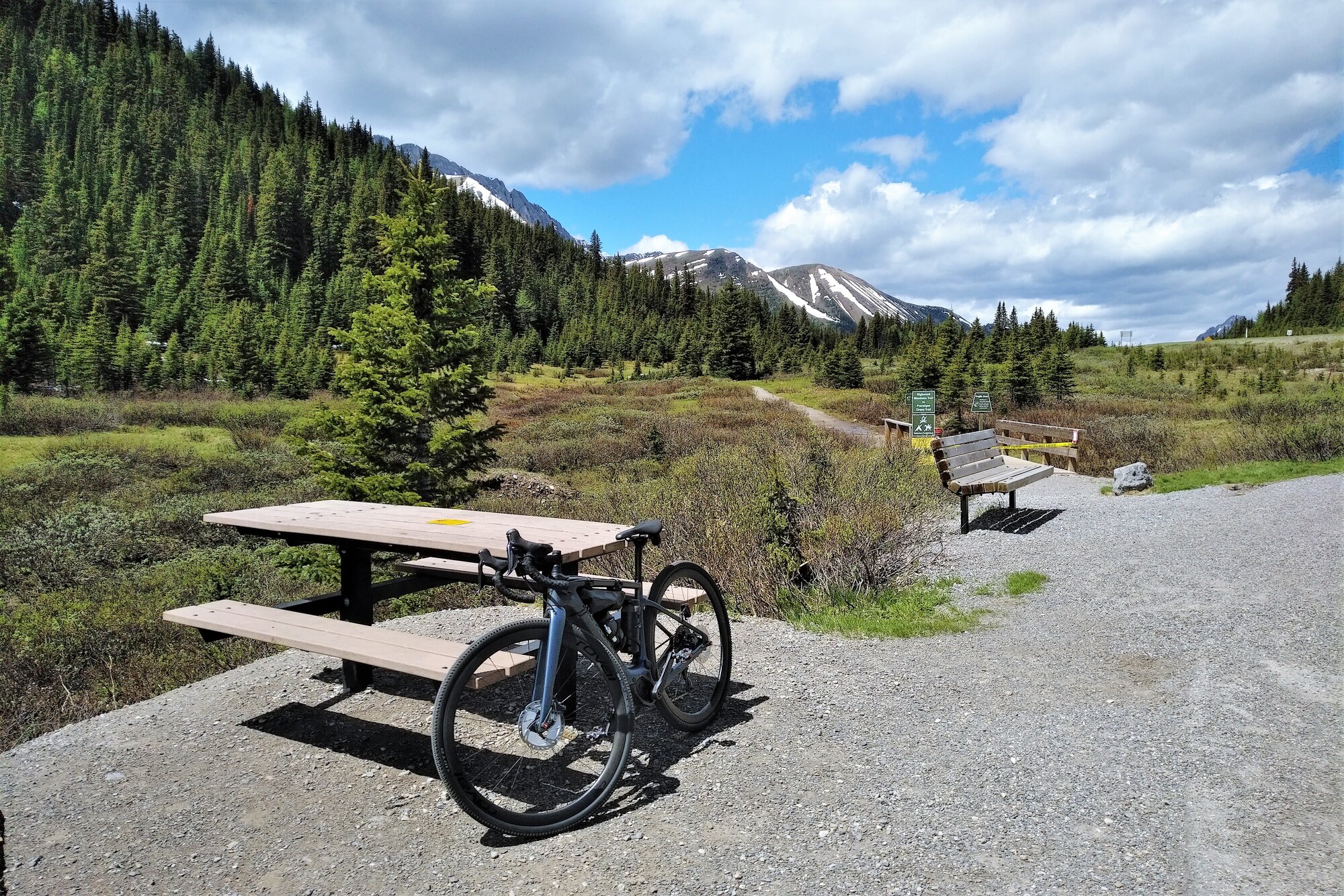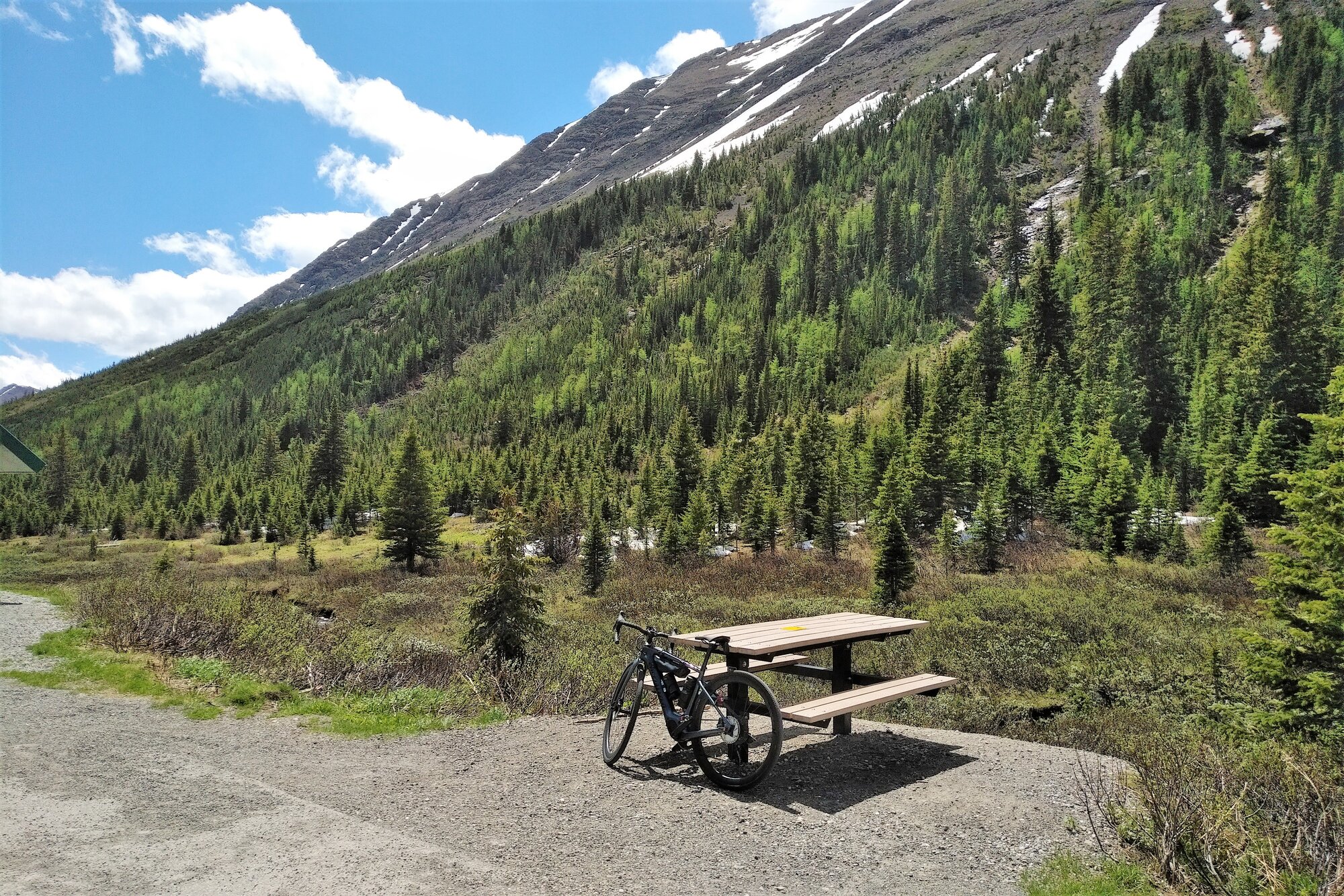 The entire ride went smoothly despite a tire puncture on a fast descent on the return leg. Not something you want to happen at almost 70 kph! The severe wobble disabled my ride temporarily as I could see my wife disappear down the descent. With no time to spare (pardon the pun) I quickly pulled over and pumped up the tire to its max and carried on slowly down the remainder of the hill. To my surprise the air held but I continued to monitor the pressure and stopped a few more times to replenish it and was able to finish the ride in this manner. A 14km stretch of road leading up to and down the Pass were in severe condition with gravel and potholes evident both on the shoulder and the main road itself. I’m afraid that Alberta winters are not very kind to alpine tarmac.