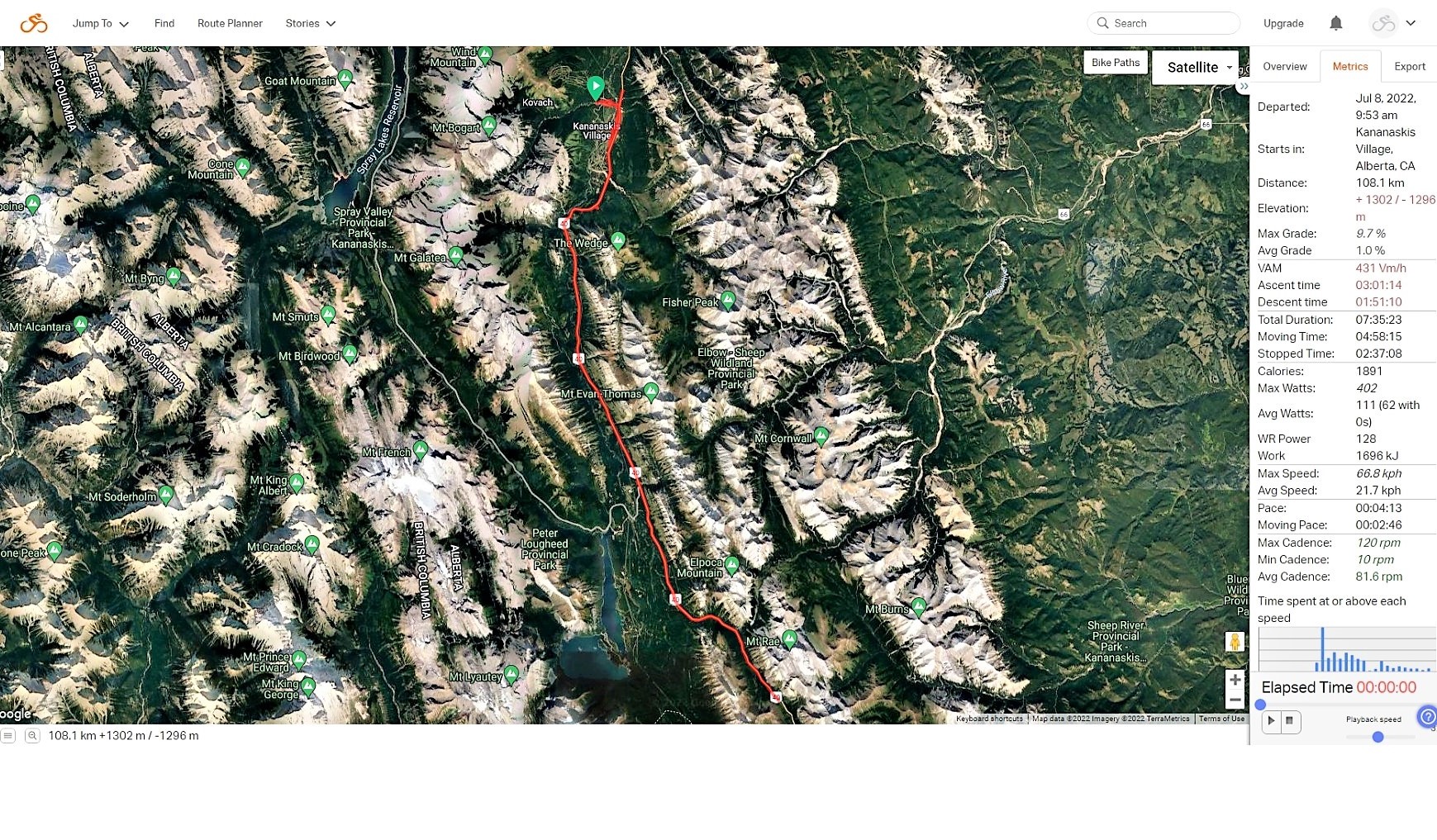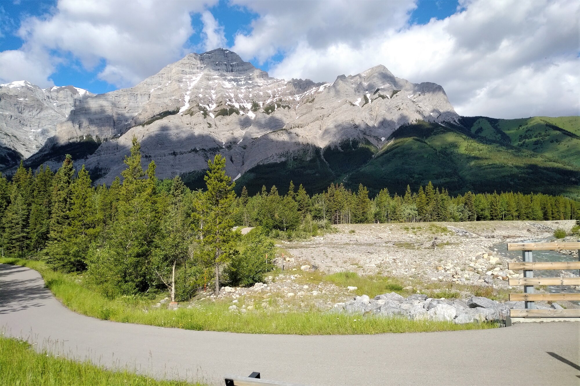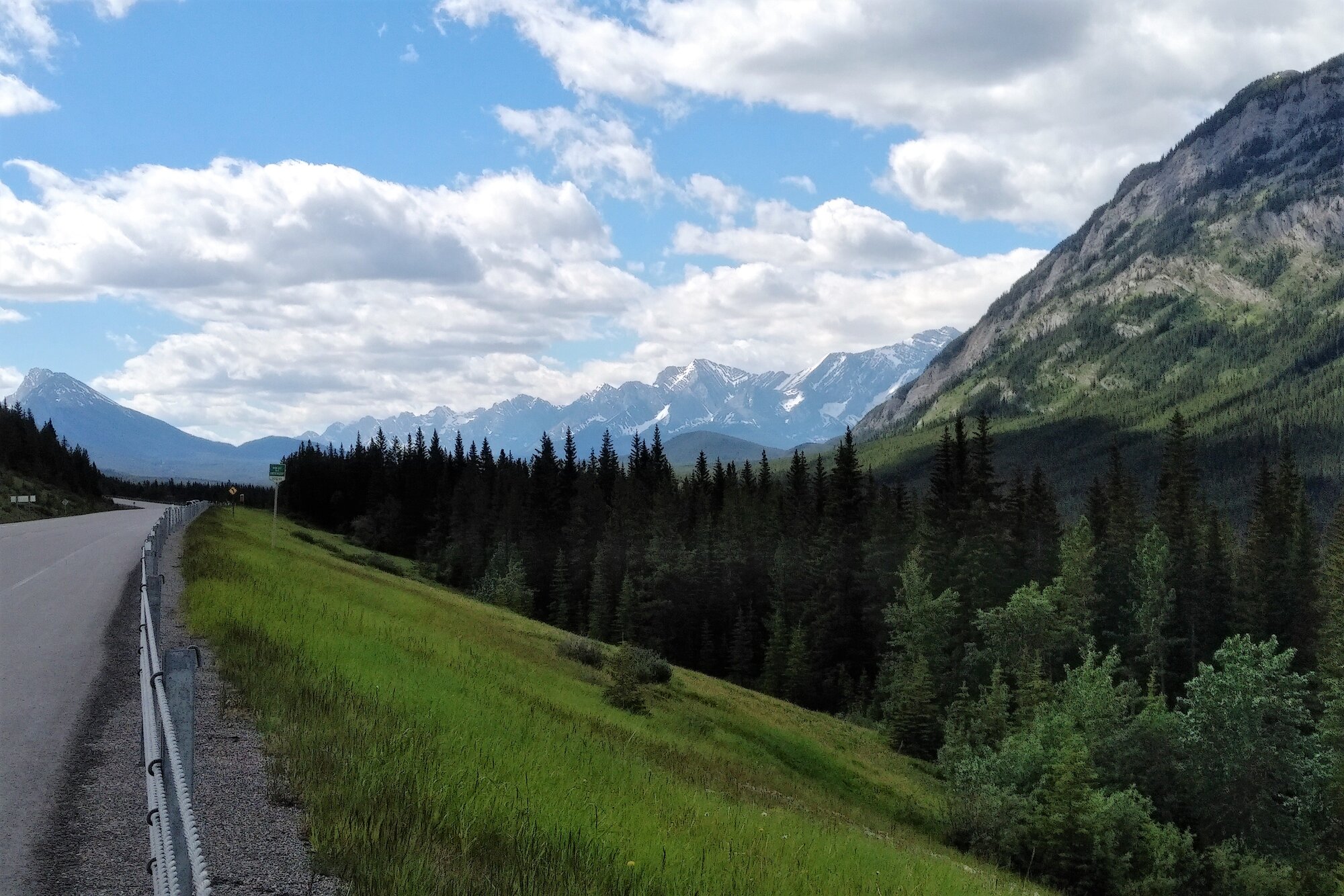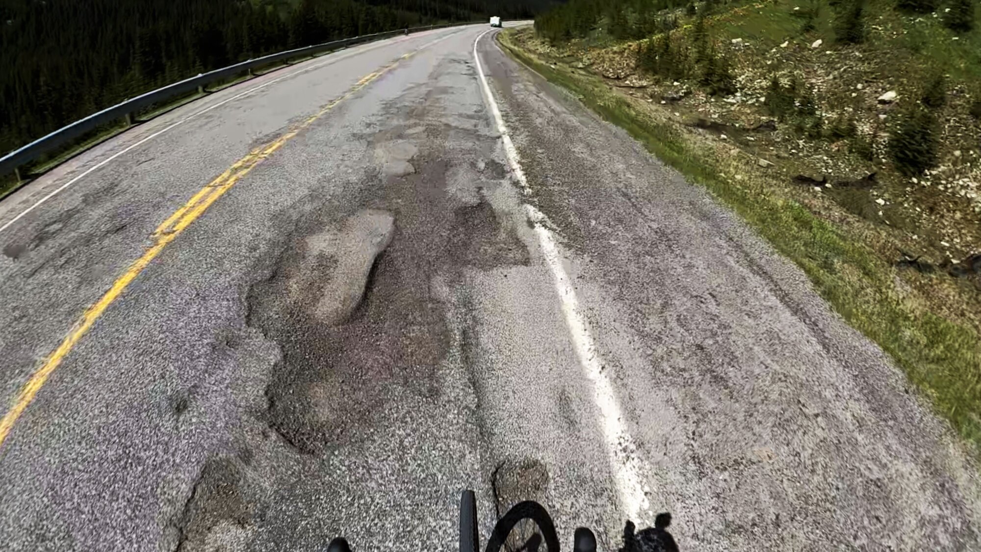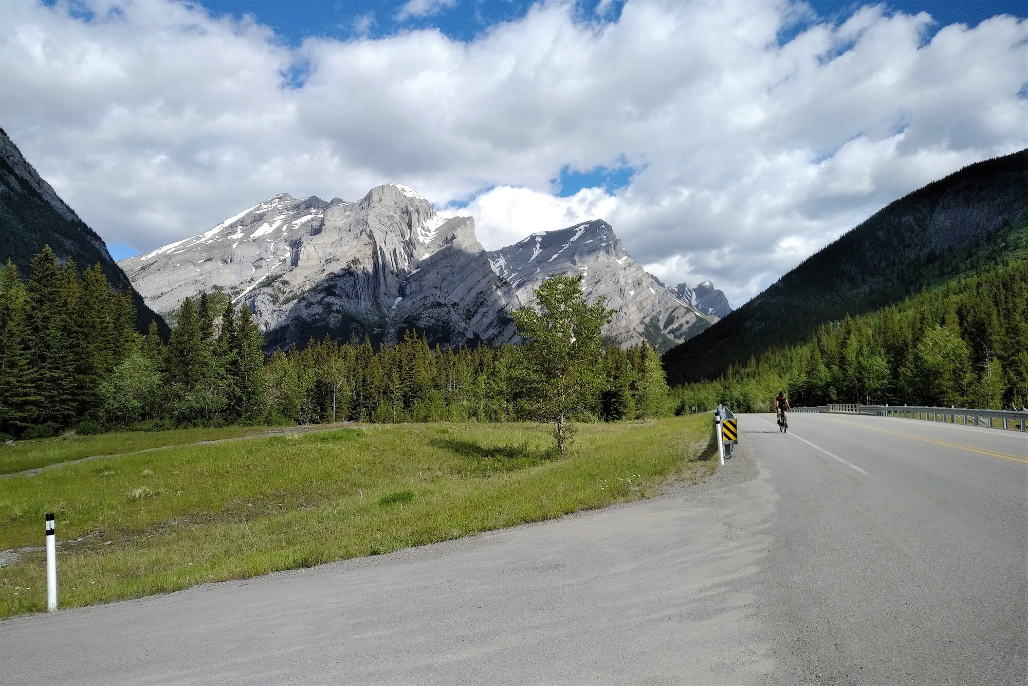 The entire ride went smoothly despite a tire puncture on a fast descent on the return leg. Not something you want to happen at almost 70 kph! The severe wobble disabled my ride temporarily as I could see my wife disappear down the descent. With no time to spare (pardon the pun) I quickly pulled over and pumped up the tire to its max and carried on slowly down the remainder of the hill. To my surprise the air held but I continued to monitor the pressure and stopped a few more times to replenish it and was able to finish the ride in this manner. A 14km stretch of road leading up to and down the Pass were in severe condition with gravel and potholes evident both on the shoulder and the main road itself. I’m afraid that Alberta winters are not very kind to alpine tarmac.