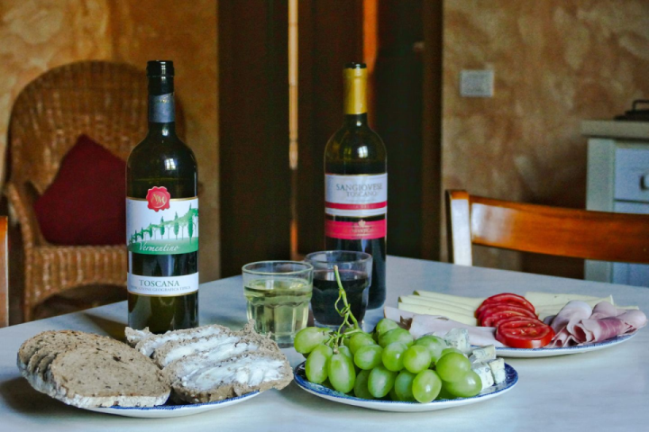 A Tuscan supper. In the background, two Tuscan table wines: Vermentino di Toscana (white), and Sangiovese di Toscana, the latter being just a Chianti without the DOC label :)