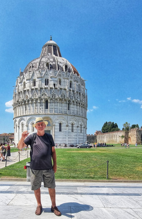 In Pisa (I will spare you the Leaning Tower photo) :) The straw hat! (Actually made of paper in China, still costly). Notice my Italian leather sandals. 75 EUR, not cheap!