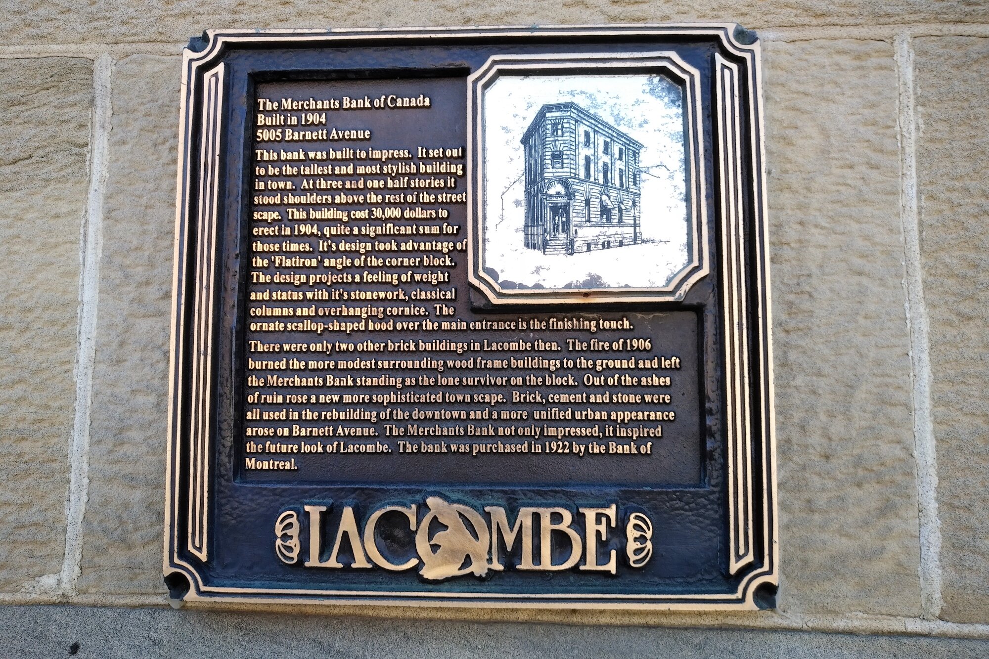 Herbert Alfred Day arrived in Lacombe in 1896 and was a very prominent businessman. His general Merchant Store sold all the necessities of a small town, form dry goods to clothing to tobacco. In 1903, Day rebuilt his store with brick. The Day Block was the very first masonry building in Lacombe. On the ground level many different stores conducted business while the second level was home to the Day Opera House. The Day Block is currently home to the Lucky Palace Chinese restaurant.
