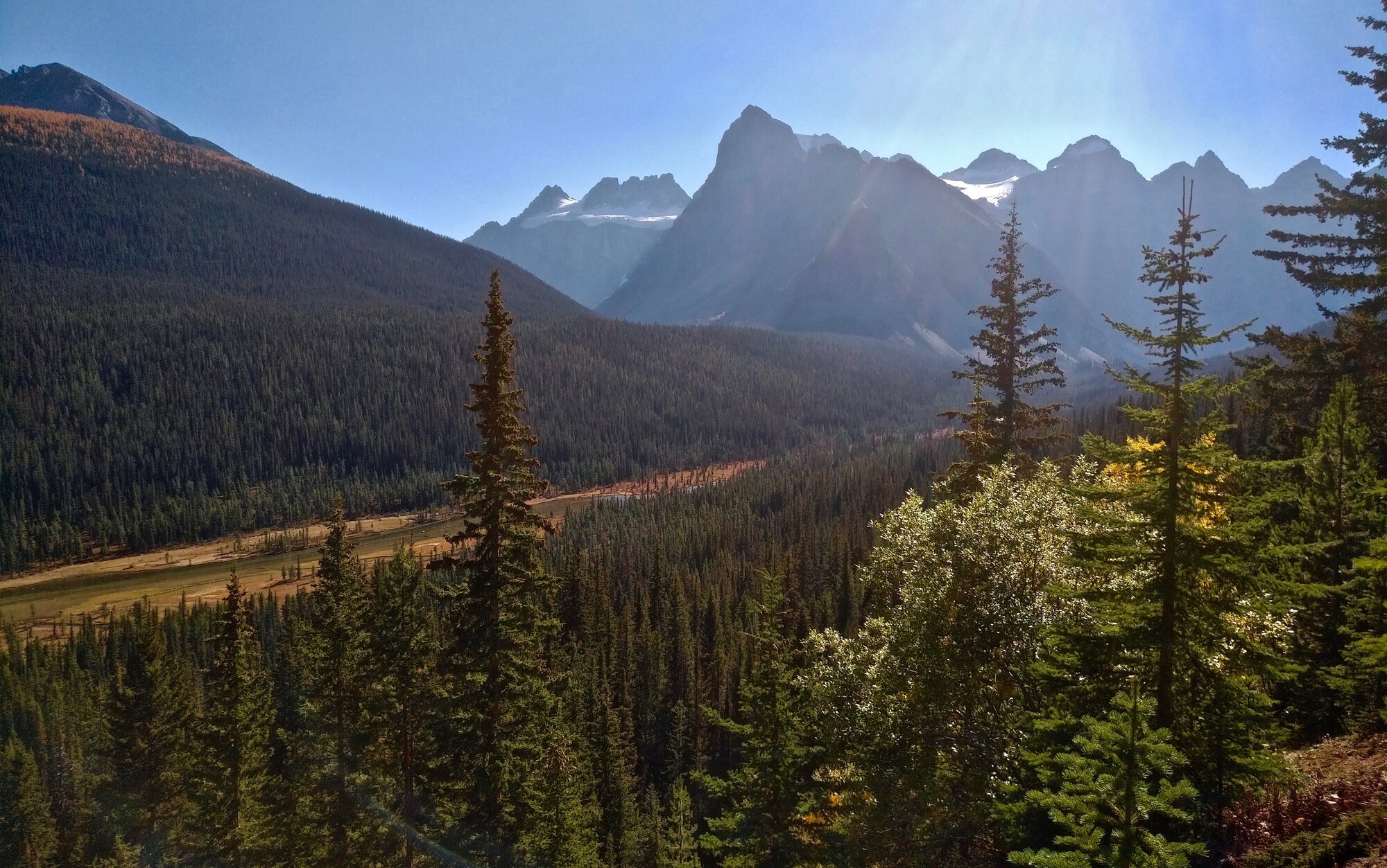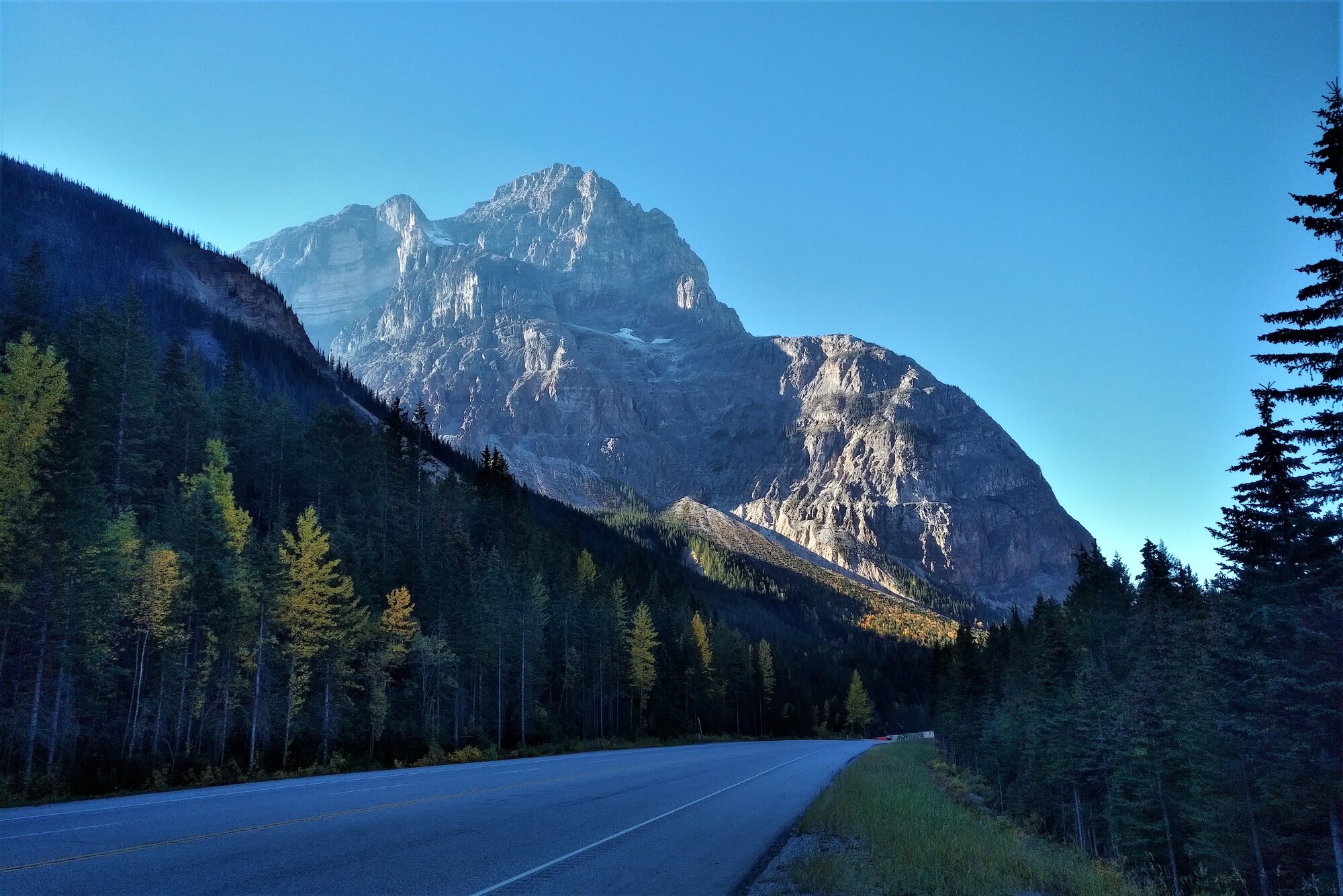 At we arrived near the Yoho Valley Road, we were greeted by the sun’s rays blanketing the craggy north face of Cathedral Mountain along the TransCan Highway. Quite a site to behold.