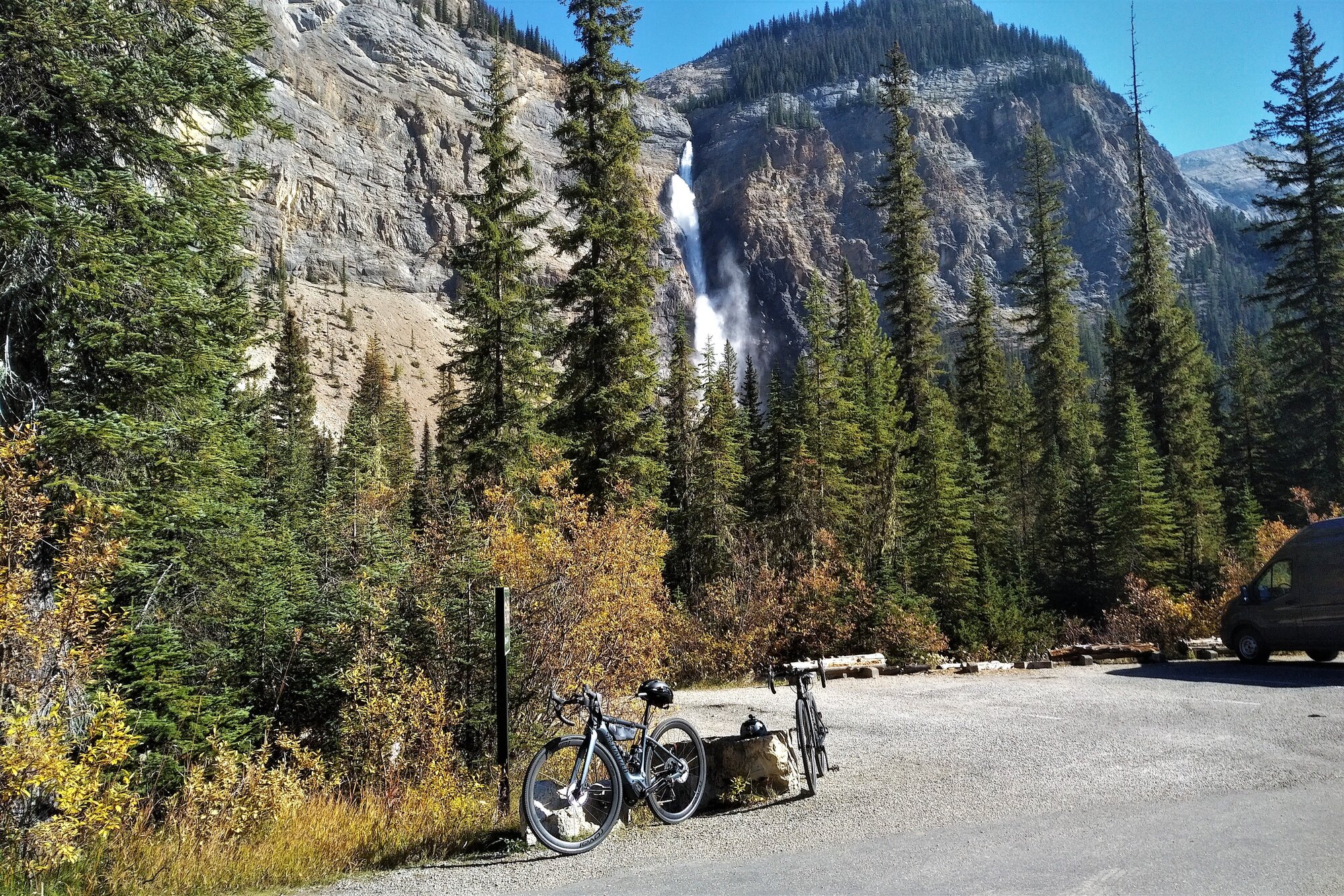 The second day of our trip to Lake Louise and points beyond was a short 26 km out and back along the Yoho Valley Road up to Takakkaw Falls near the AB/ BC border. We only logged 52 km during the two days we were there with a total elevation gain of approx. 886 meters or just over 2900’. My battery level, starting from a full charge to what remained afterwards, was a decent 88% according to Mission Control. Not significant numbers but both Moraine Lake and the Falls were alpine destinations that we wanted to complete before it became too cold to ride. The fall scenery and views, in particular, were reason enough to make this a must do trip.