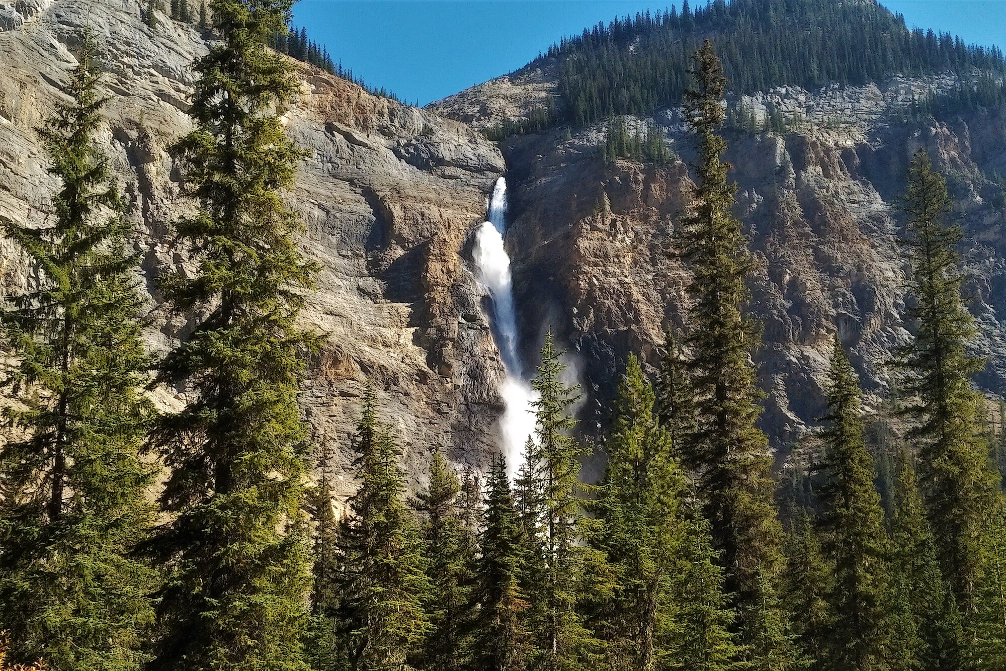 Stunning Takakkaw Falls is notably the second highest in Canada towering above at 380 meters or 1224’ high. The fall’s name apparently originates from the Cree language meaning ‘Wonderful’.