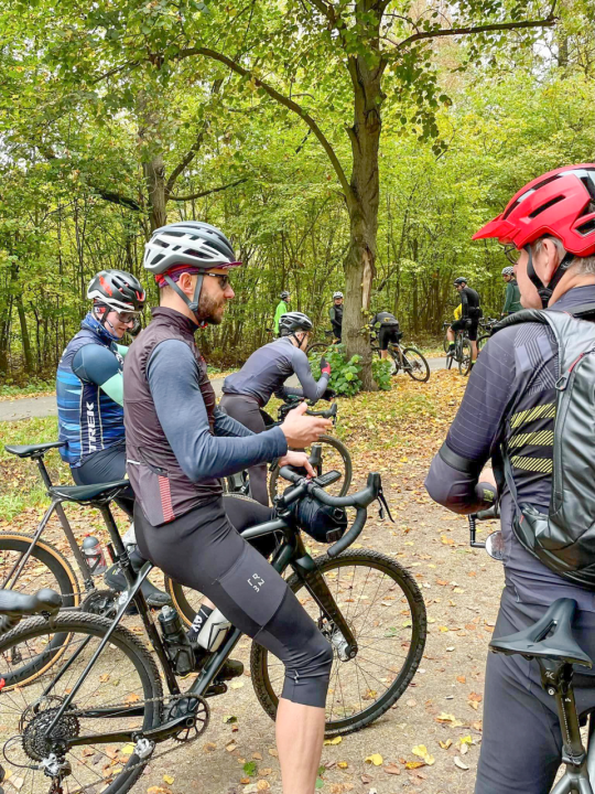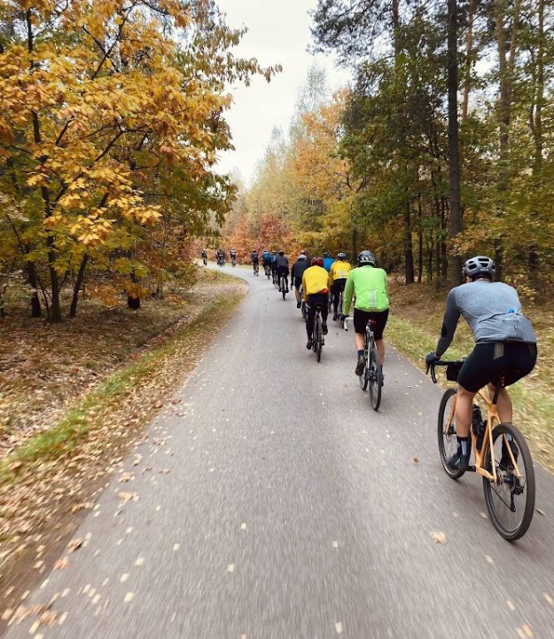 (Photo by Tomek M.) Immediately, the whole bunch split into "the competing group" and "the main group". Both groups lived quite different lives! For instance, the main group was encouraged by a local participant to ride an unplanned singletrack; the competing group was precisely following the prescribed route. The fast group took some stop at a grocery store; they also experienced a flat. Meanwhile...