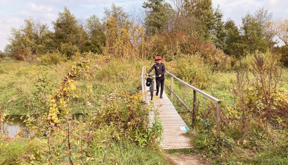 (Photo by Jacek Mikulski). Me crossing a walkway over River Rawka.