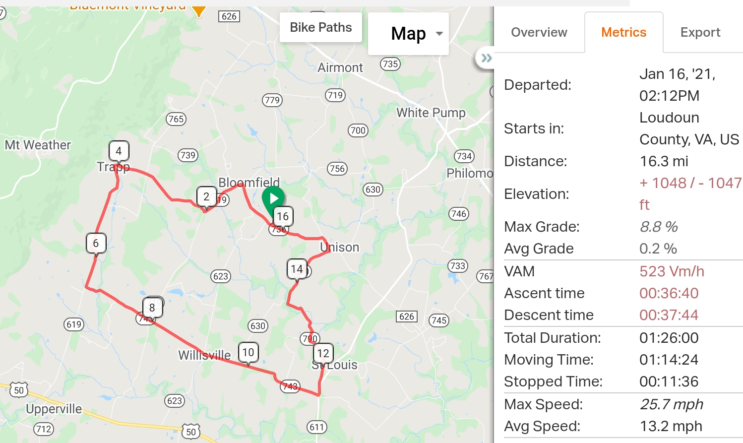 The route and Strava data: