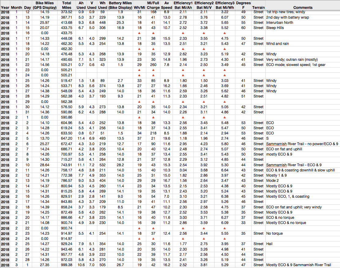 Just wanted to give a quick 999 mile update to my experience with my modified HF1000. Overall, I am satisfied with its performance. In Seattle winter weather it has performed well. I have only had to lay it down once in the snowy slush due to loss of traction on my street tires (Origin8 Supercell). 99% of my riding has been on asphalt. I was caught in a pea-sized hail downpour that lasted long enough to put down about 1". My tires gripped surprisingly well until the hail started to melt; which is when I fell. The Supercells do have good traction and are quiet, but their amount of self-steer (or whatever you want to call it) is pretty extreme. However, it is not so bad that I would consider tossing the tires. I have found that the 42-tooth chainring has worked well for me. I was able to bike without battery power for about 13 miles on the flat with no problem (68 and 40 lbs overweight). My battery has performed well. With 999 miles I think I have lost maybe 2 tenths of a volt on the top end. I haven't had to have any of my spokes adjusted. In order to get some exercise I generally ride in ECO & 9 on a 14 mile ride with about 622 ft of ascent. On the steepest parts I'll use assist levels 1-3 for a short time. This gives me an extrapolated range of approximately 40 miles with my 17.4 battery. Attached are some stats that may be of some interest.