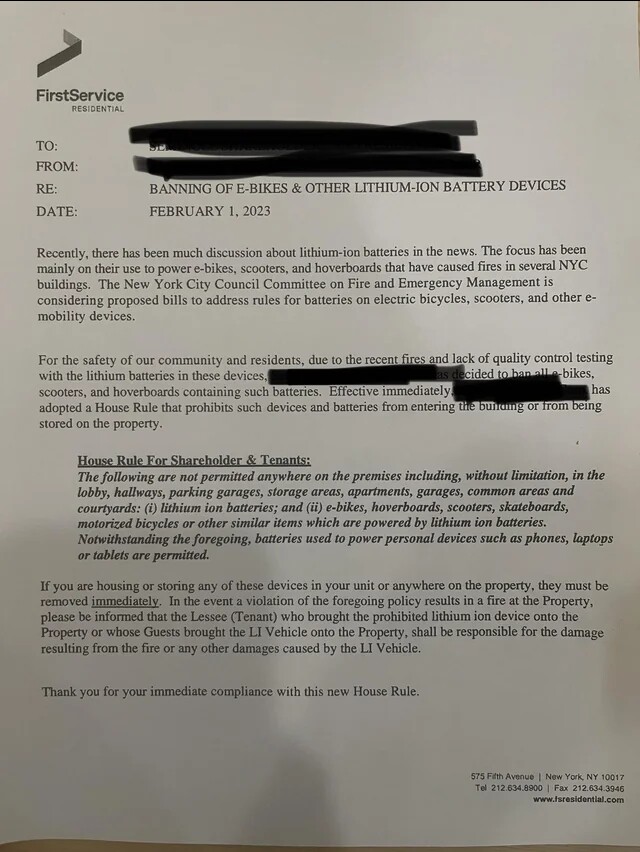 The second item is a letter from the property manager of an apartment building advising of the banning of products with lithium batteries being stored on premises of the property.