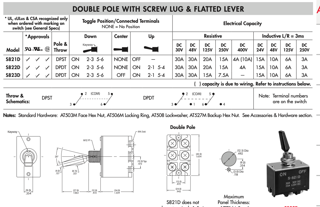 Type: (ON)/OFF/(ON) ;Connector Type: DPDT ;Power: 15A 250VAC / 20A 125VAC