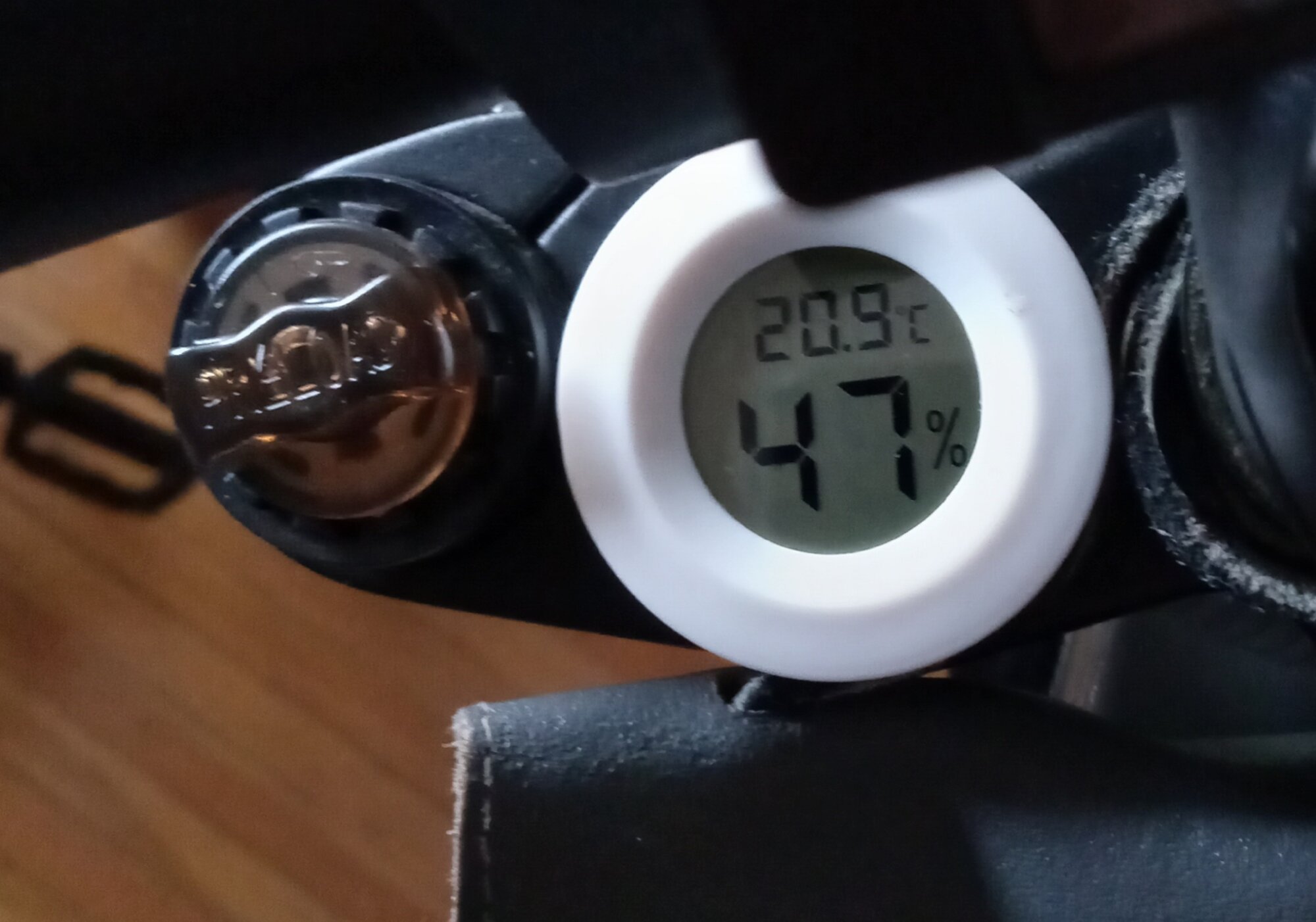 💠 Thermometer arrived yesterday. Glued it to the Liberty with sticky crafting dots. Displays temp and moisture readings.